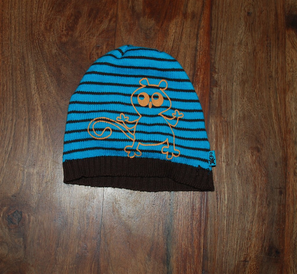 Billed 19: Blå og brun stribet hue med orange dyr på. Brugt få gange.