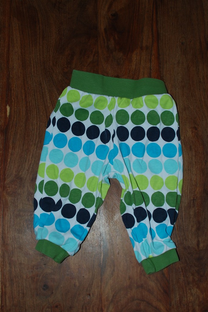 Billed 22: Hvide bukser med grønne og blå prikker. Grøn kant. Fra H&M. Brugt få gange.