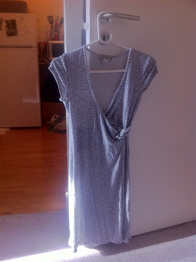 nr 2 kjole med blomster på : er faktisk en vente kjole - det vidste jeg ikke, så jeg gik gladeligt i byen med den 1 gang. opdagede det først for 1 måned siden, det er en størrelse small og (jeg selv er en medium/large og kan sagtens være i den uden den strammer) - men ok, det os ventekjole