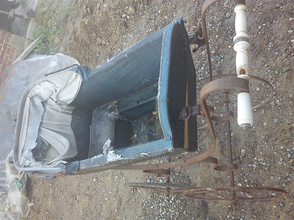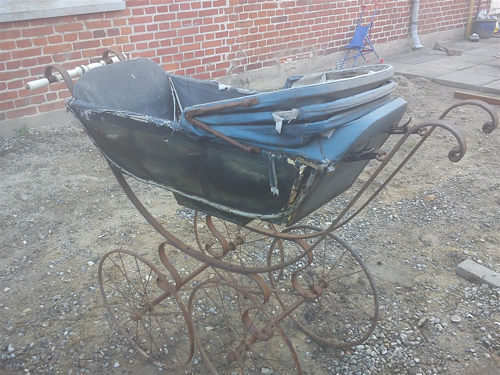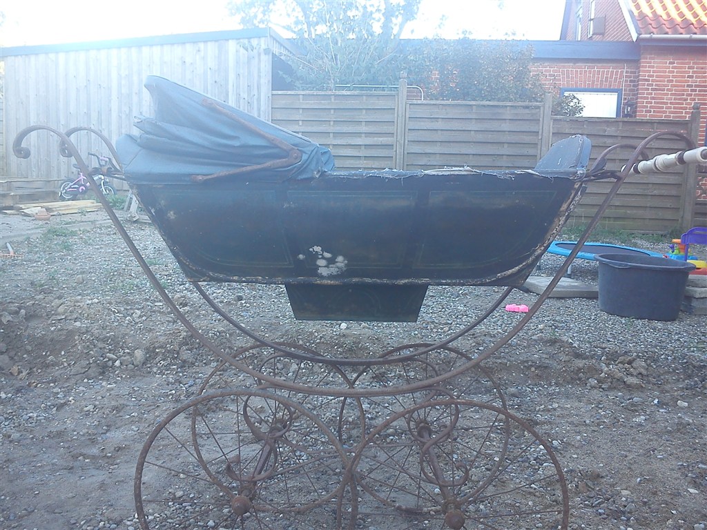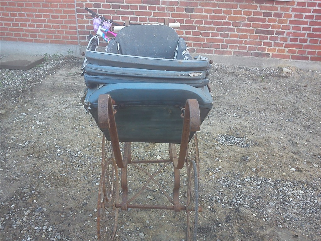 uha uha, så har jeg en barnevogn du skal se på. håndtaget er lavet af porcelæn, kassen er lavet af træ og bliver holdt med læderemme, kalechen er af læder. den var i sine gode dage forret med tang der er en kasse som vi tror må have været til en varmedunk måske