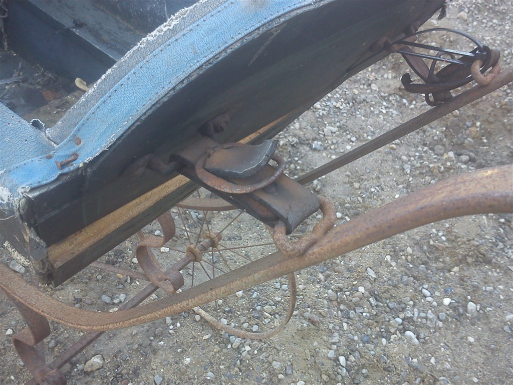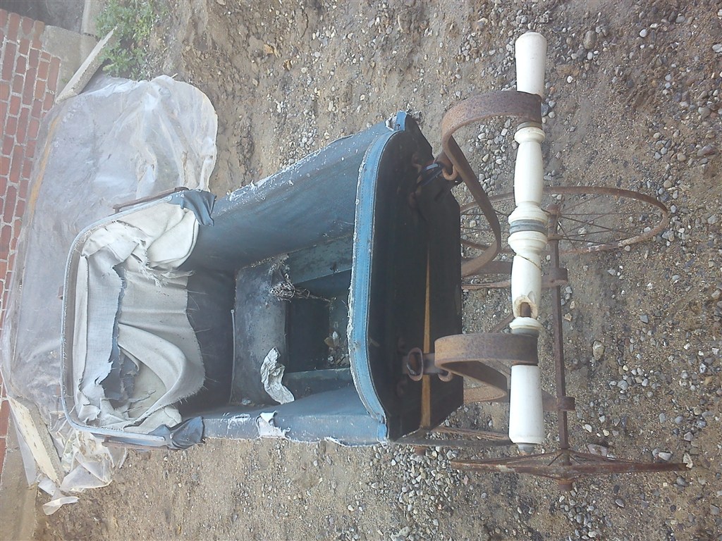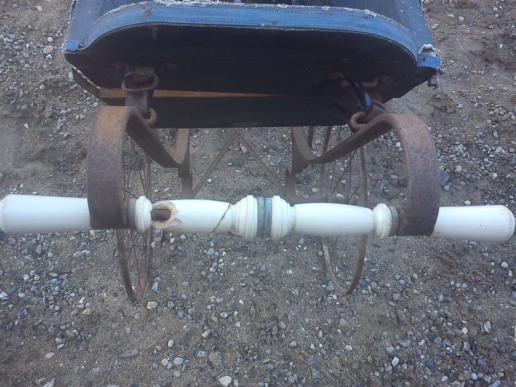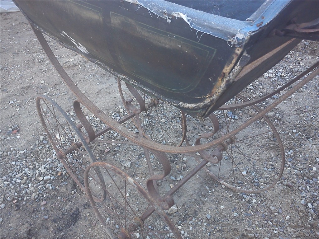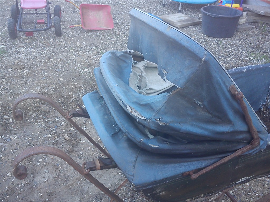 uha uha, så har jeg en barnevogn du skal se på. håndtaget er lavet af porcelæn, kassen er lavet af træ og bliver holdt med læderemme, kalechen er af læder. den var i sine gode dage forret med tang der er en kasse som vi tror må have været til en varmedunk måske