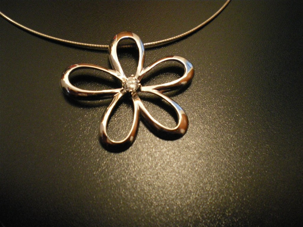 Billede 2: En unik designet sølv blomst som hænger på en sølv-wirekæde. Super flot smykke til både hverdag og fest. Brugt en enkelt gang.
