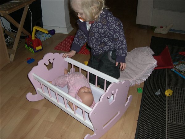 Ej, hvor er den fin. Er den i træ? Sådan en (eller to) vil jeg også ha'... Hm, de har jo bare senge a la dukke-weekendsenge, der var en del af et sæt med dukkevogn, højstole og alt muligt (billigt...) gejl. Er den lige så fin som det ser ud til på billederne?