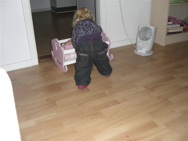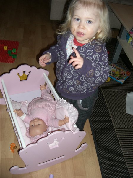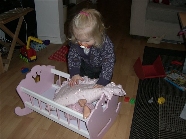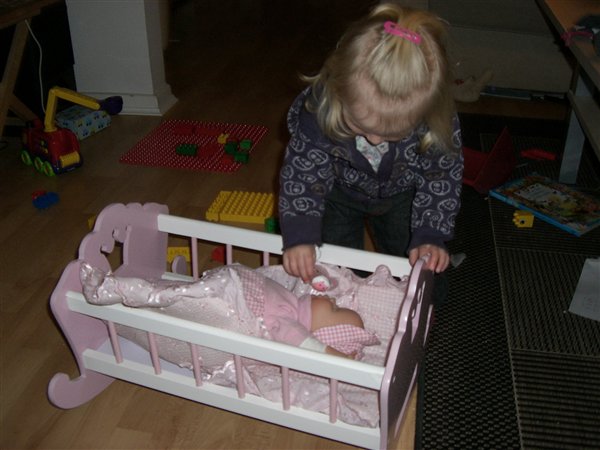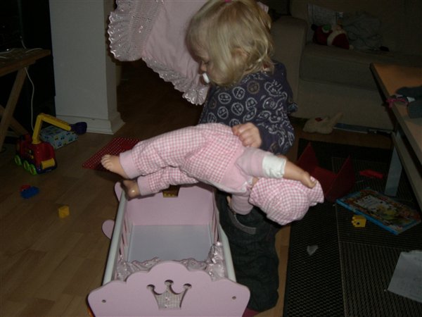 Hvor er hun sød, når hun står der og putter dukken. Det er bare så kært. Nanna er også meget omhyggelig, når hun putter dukken i barnevognen - det er så sødt (Signe kyler den på hovedet ned i vognen og kører ræs