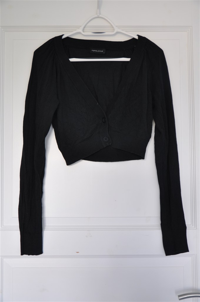 Billede 2-3: Sort bolero med mønster ved knaplukning (billede 3) - kunne godt bruge en farvning