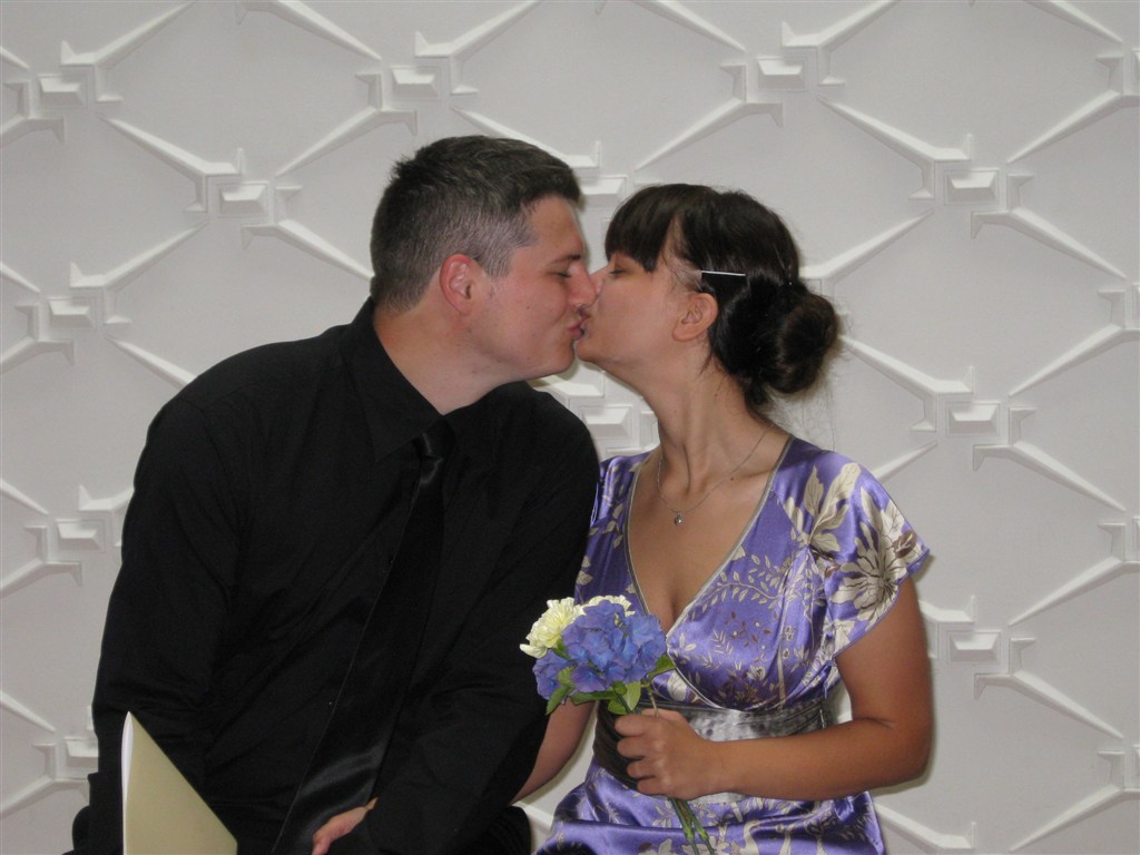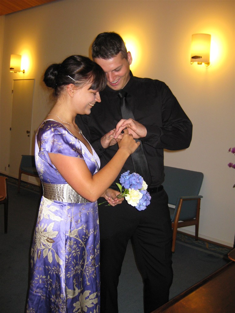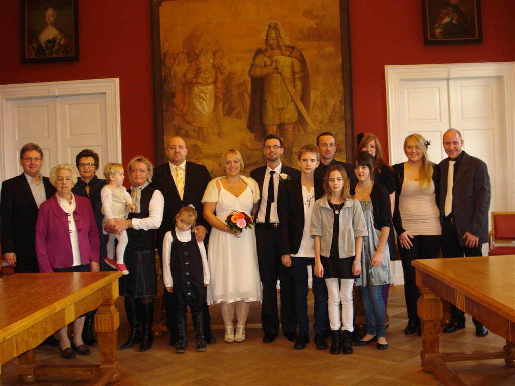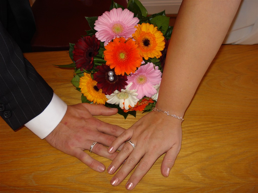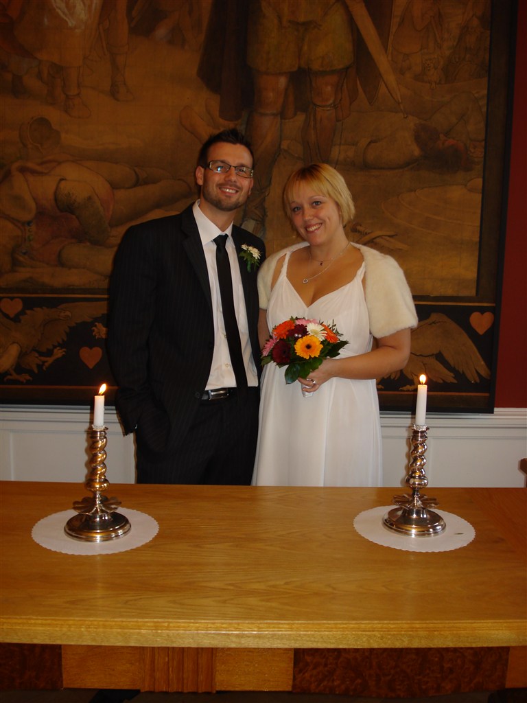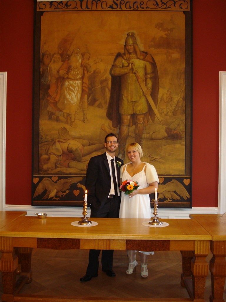 Nu blev vi jo gift om onsdagen på rådhuset og "Proforma-viet" om lørdagen i det fri, så det var om lørdagen jeg havde den hvide kjole på og vi holdt festern.