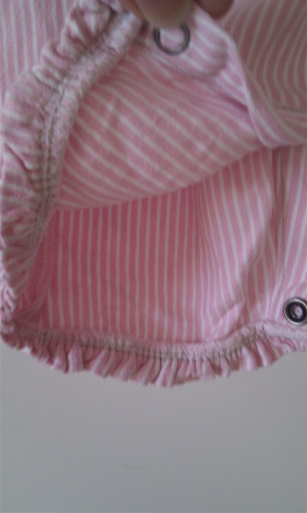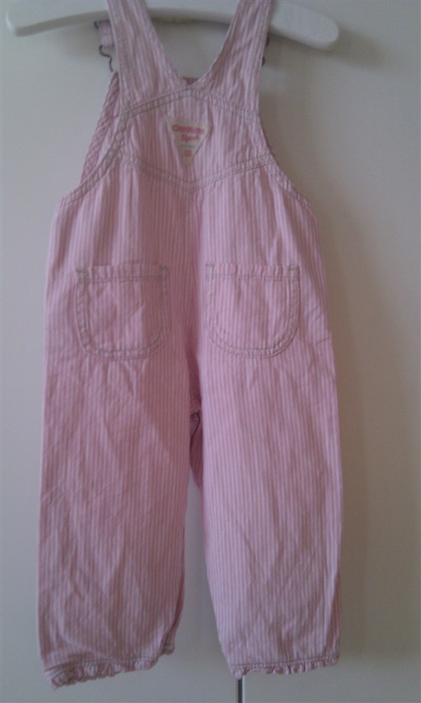 Osh Kosh overall stribet hvid/lyserød, str. 18 måneder. Der er knapper forneden så man kan komme til at skifte ble uden at tage selerne af. Stoffet er ikke særlig kraftigt, dejlig blødt og til at røre sig i. Der er inge slid eller pletter. Byd :-)