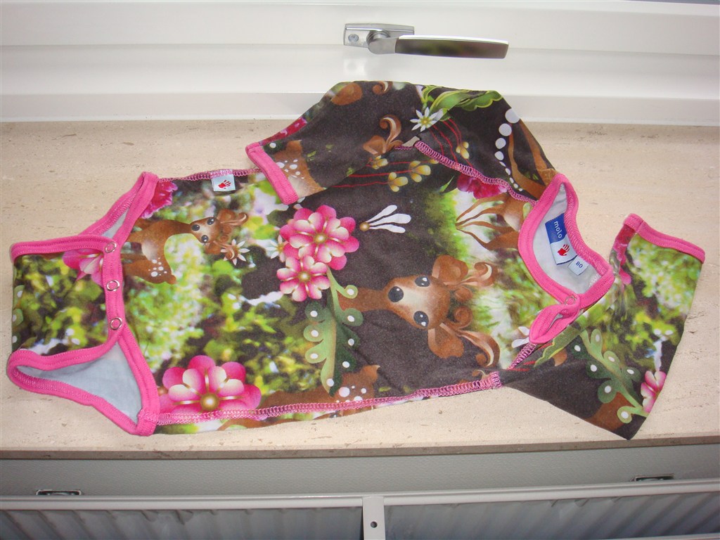 Jeg har den i body et sted i gemmerne, i str. 80 mener jeg. Den er dog rimelig stor i den, og min datter har brugt den indtil hun var 15 måneder.