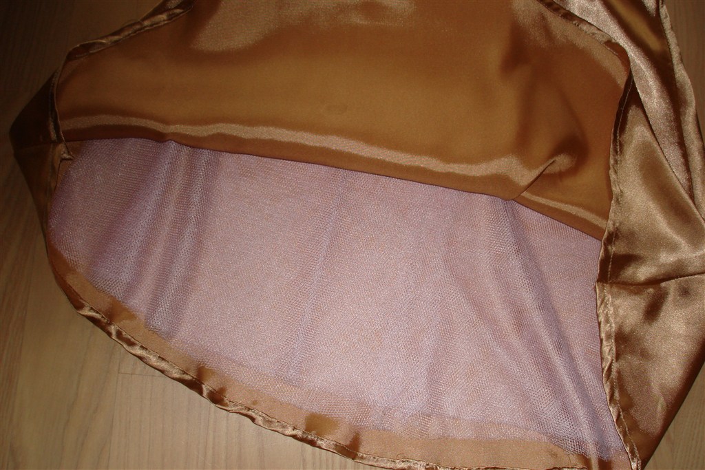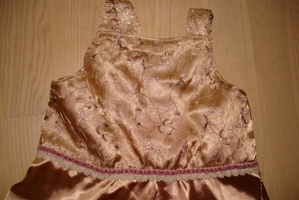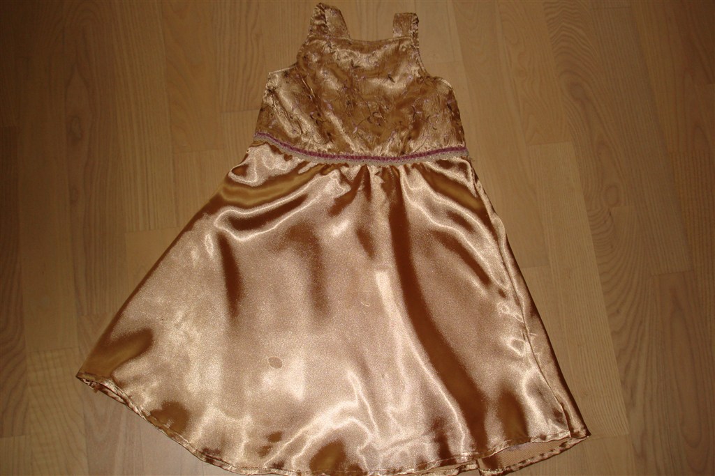 dejlig guldkjole med smukke detaljer sælges.. der er 2 lag lyserød tyl indenunder så den strutter dejligt.. den svarer til 104 og er brugt 3 gange uden pletter