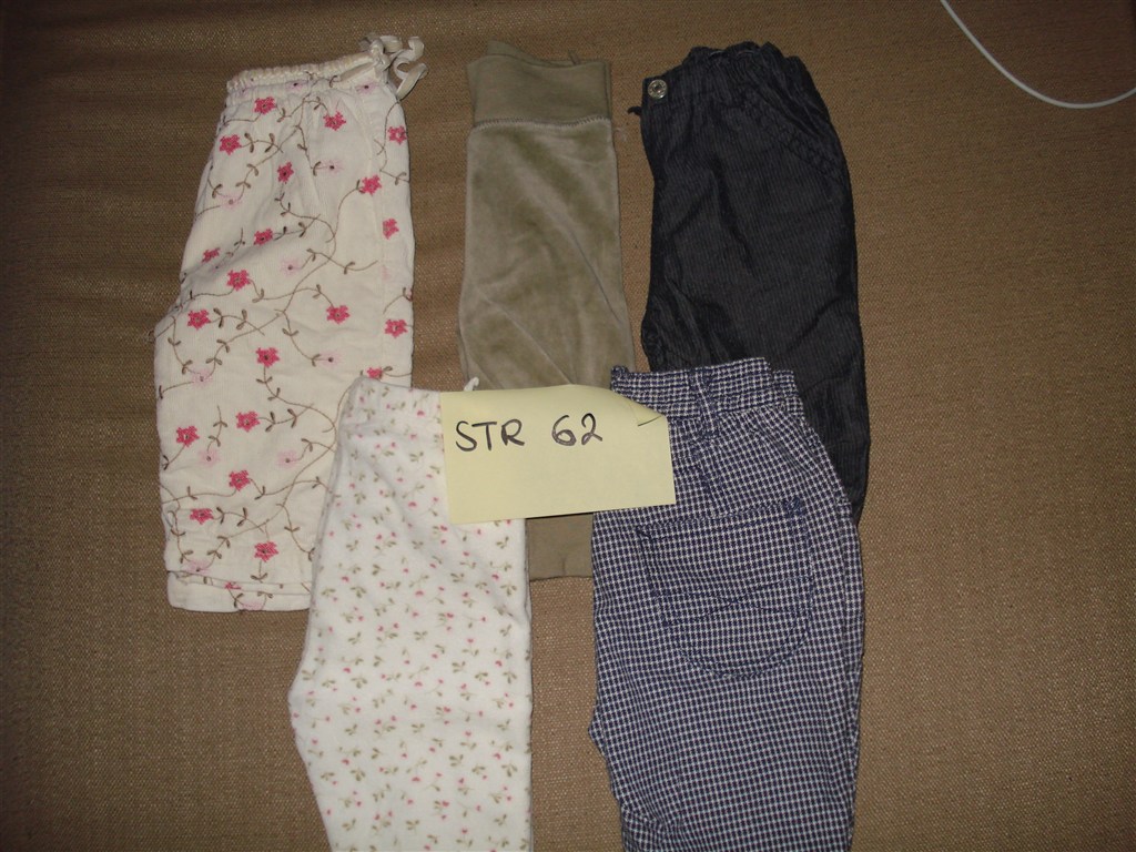 De blå, grå og sorte bløde bukser i str. 56 på billede 5 samt de brune i str. 62 på billede 6 til 40 kr