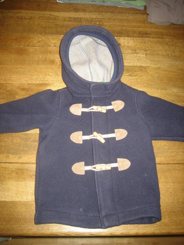 Jeg har denne duffercoat fra Benetton liggende i en str. 74. Det skal lige siges den er meget stor i det og svare nok nærmere til en 80/86.