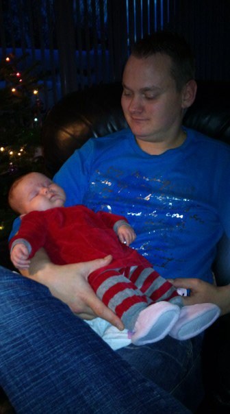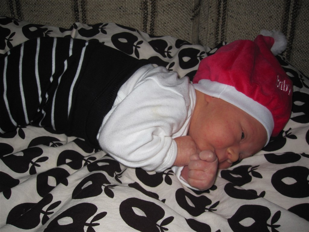 Her er min lille nissepige fra sidste år. Der var Isabella kun 7 uger gammel, så hun sov sig igennem det meste af aftenen Hun havde nissetøjet på fra Super Brugsen, som mormor havde givet os med i barselsgaven