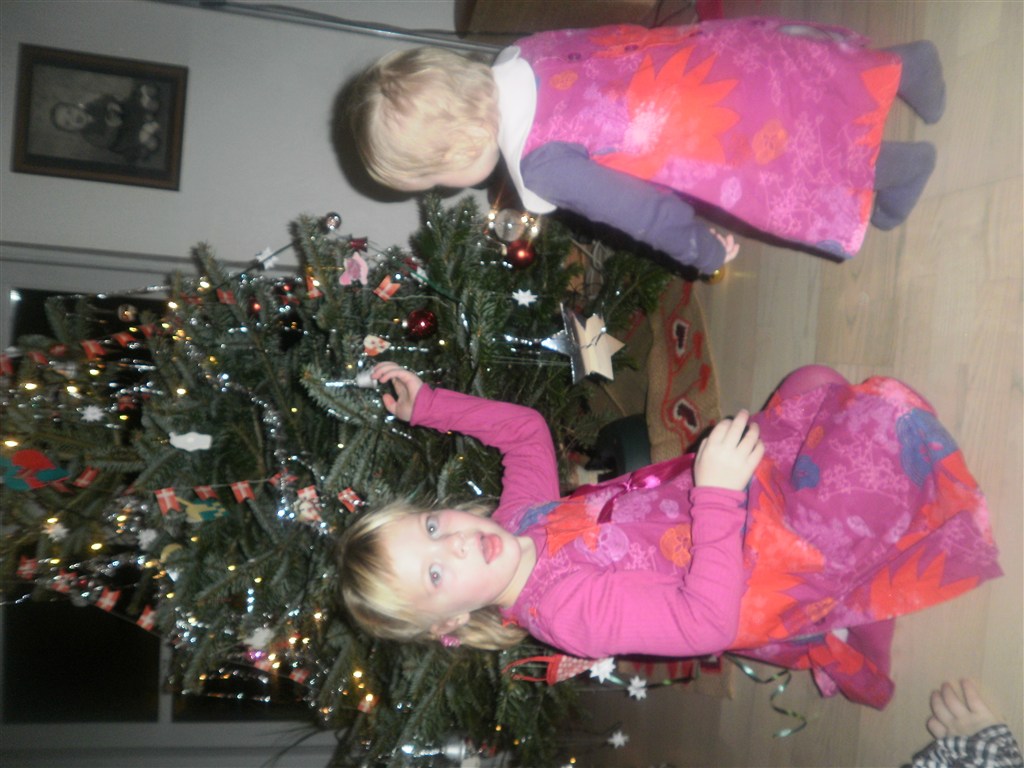 Løkkemor skriver: Her er så et lille udvalg af julebillederne af pigerne... Billede 1: Løkkes 2. jul Billede 2: Løkkes 1. jul Billede 3: Løkkes 3. jul Billede 4: Løkkes 4. og Helenas 2. jul Billede 5: Løkkes 5. og Helenas 1. jul Vi har den tradition af mormor syer julekjoler - i starten jo kun til Løkke, men nu til begge piger i samme stof og nogenlunde samme facon. I år bliver det velourstof rød med lyserøde hjerter.