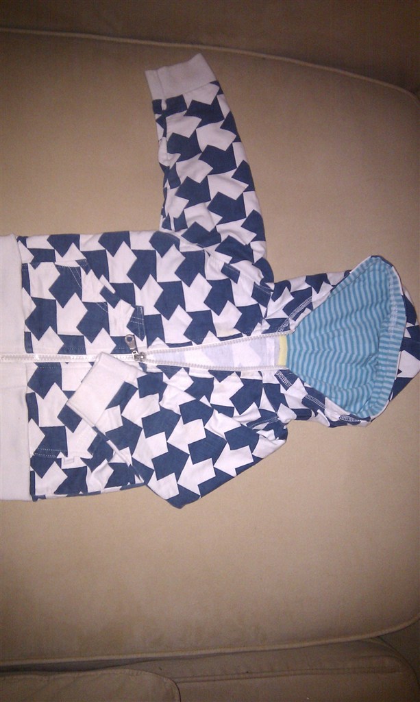 Minimyo hættetrøje, råhvid og petroleumsfarvede pile, stribet foer i hætte. Vakset i Neutral og fra røgfrit hjem, byd :-)
