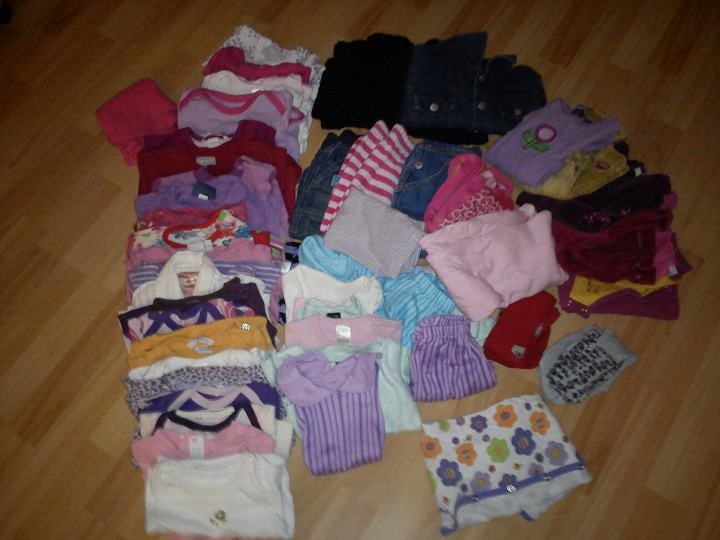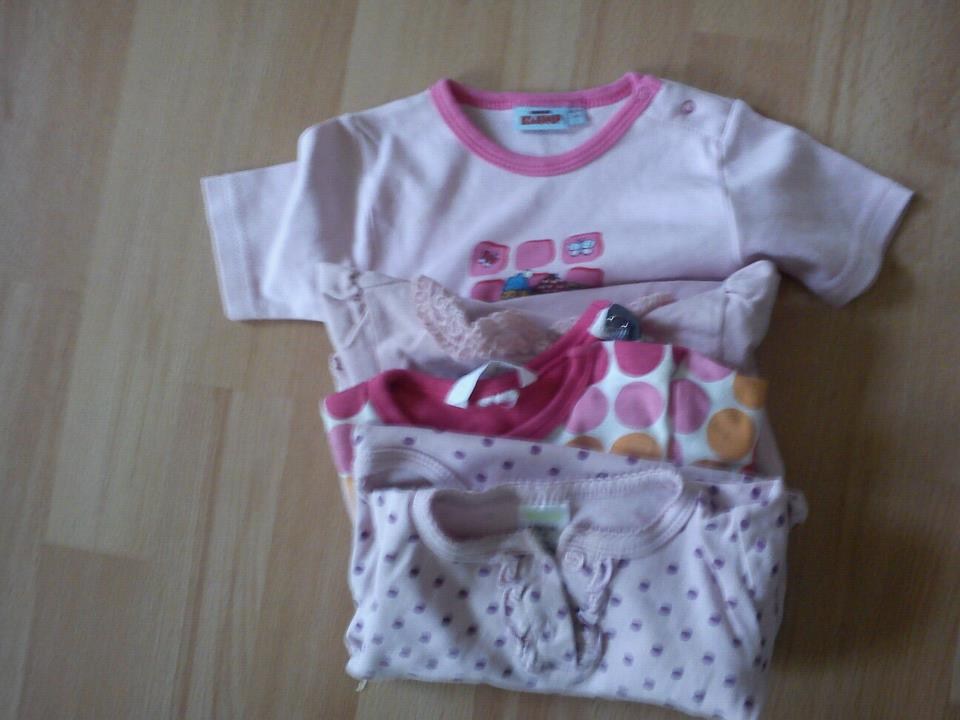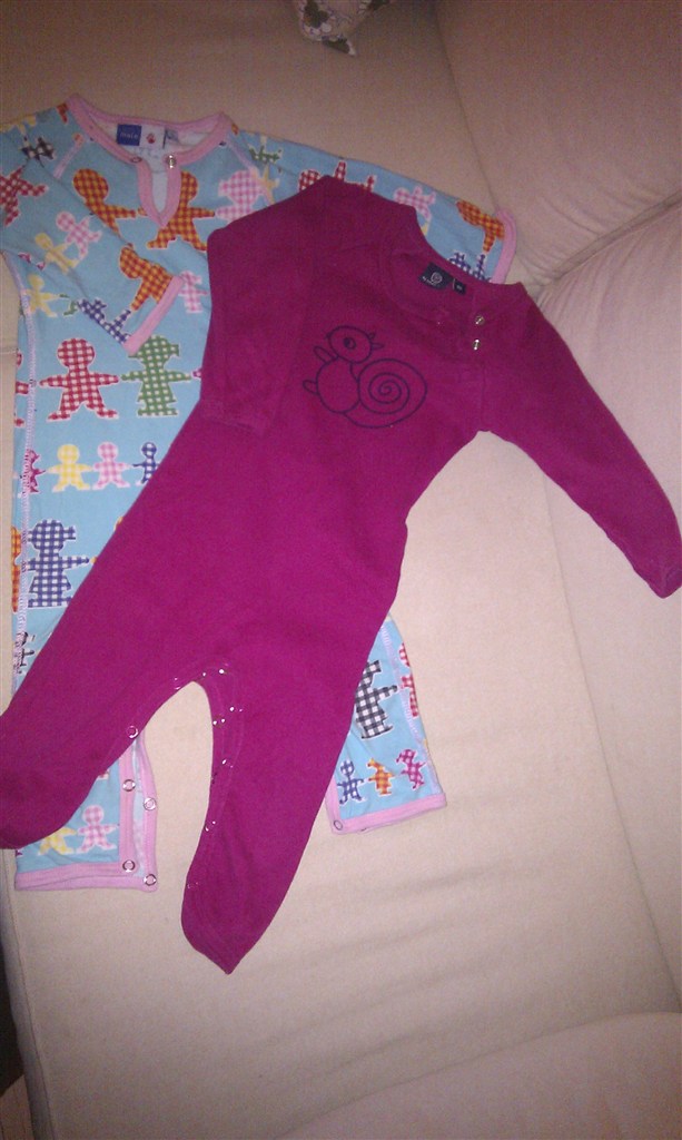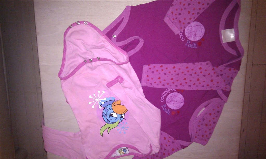 De tre langærmede bodyer er str. 70 for den med Andrea, og dem med Peter Plys er str. 80.