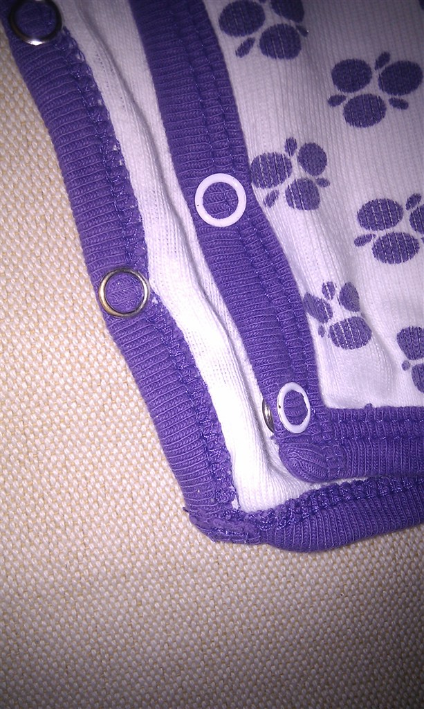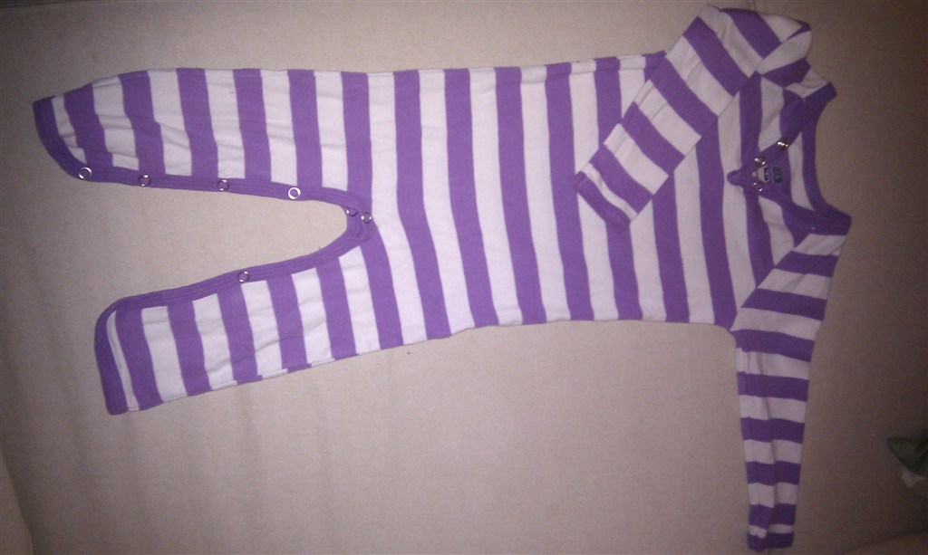 Katvig, heldragt, hvid og lilla-stribet, str. 74. Der mangler et par trykknapper ved venstre ben