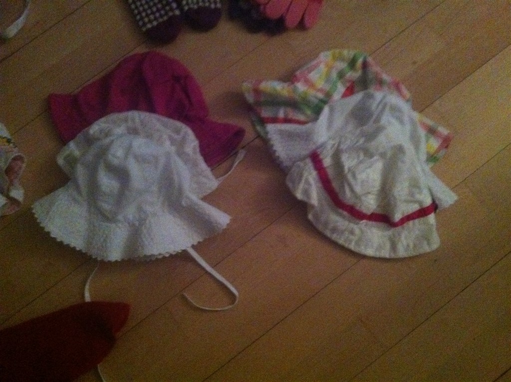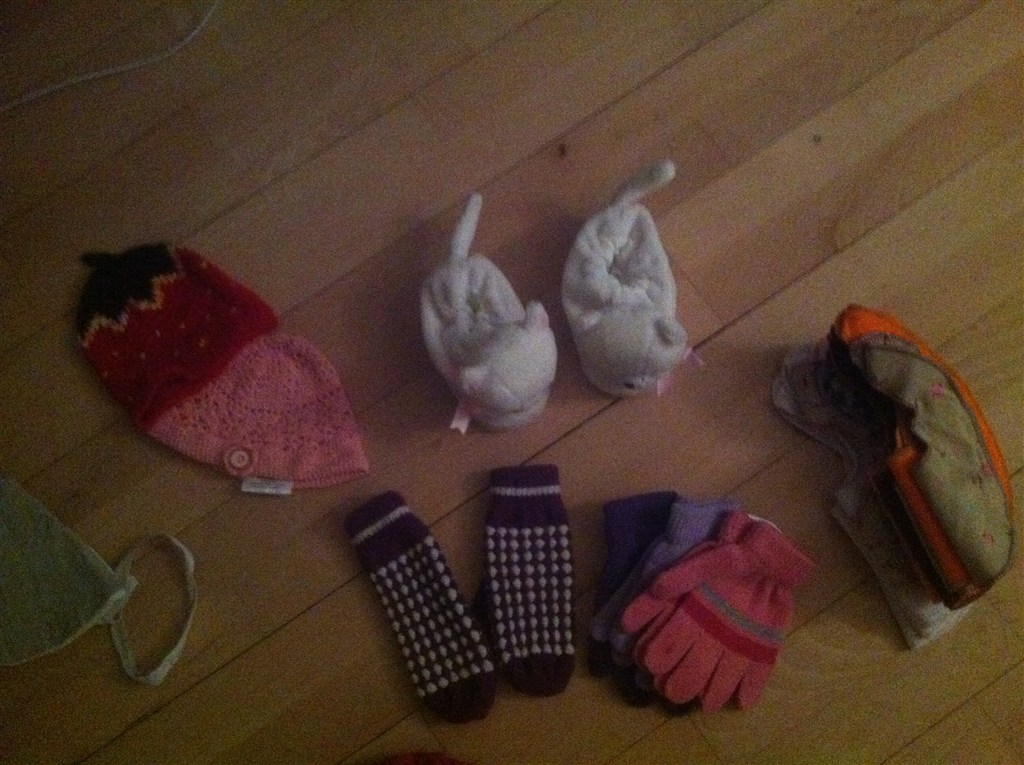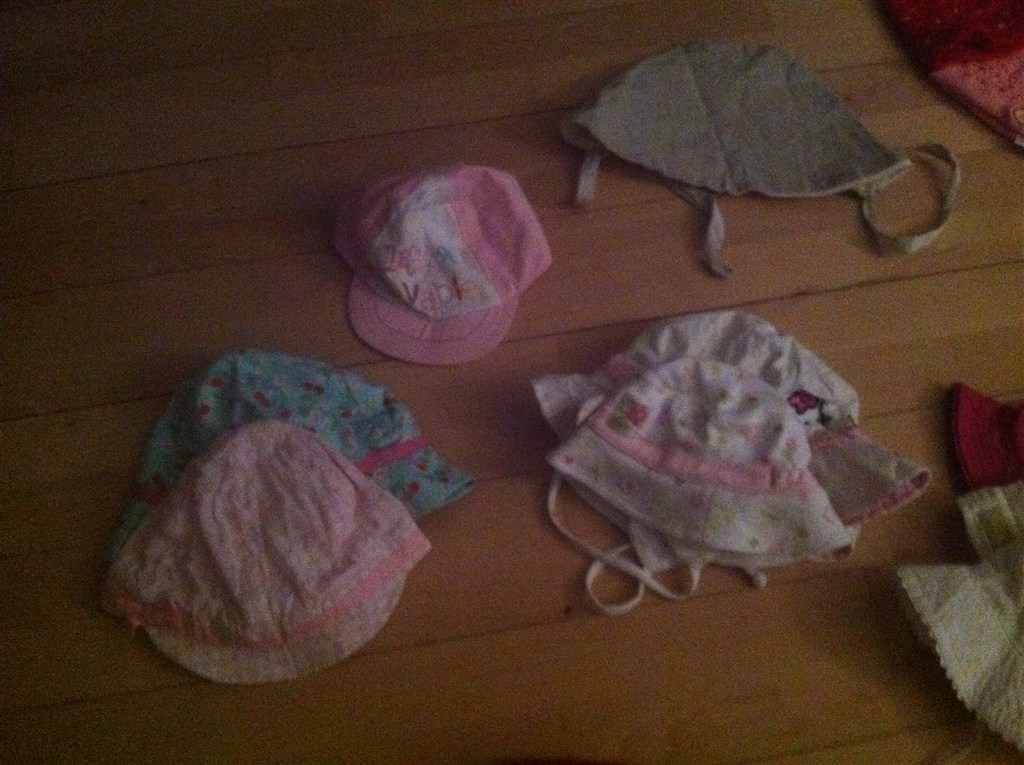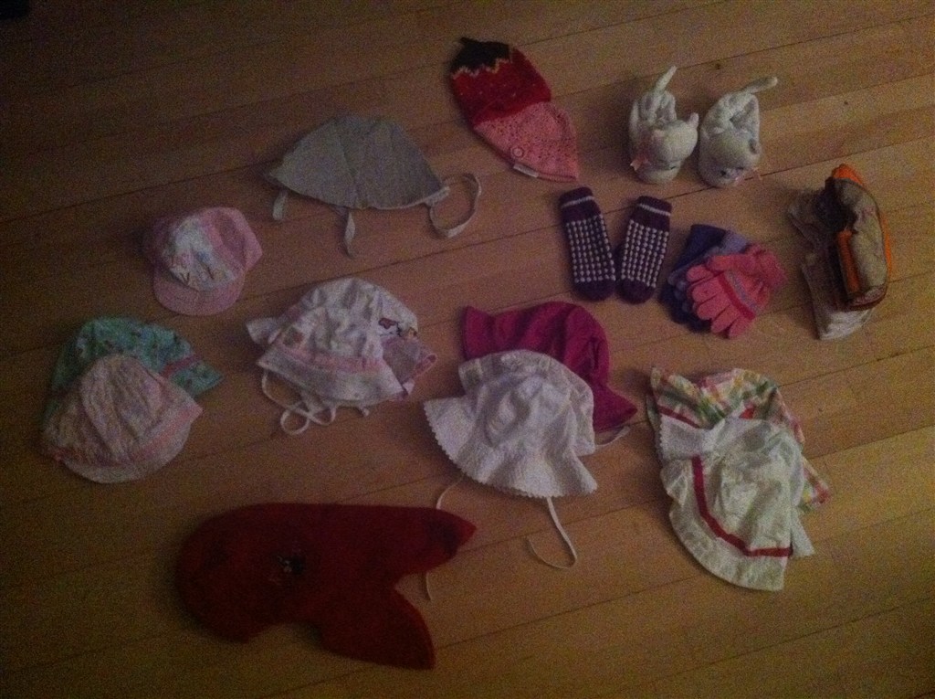Har en lille pose med Vanter/luffer, Hatte/huer, hagesmække og sutsko som sælges billigt samlet.