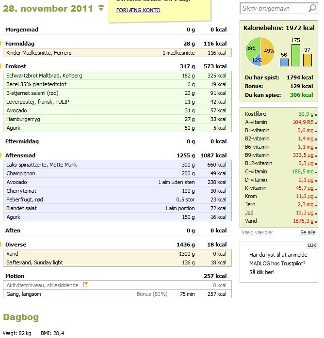 I dag er første dag, og jeg synes det er gået godt. Det har været lidt svært fordi vi bare havde NADA mad i køleskabet, så jeg startede dagen med en mælkesnitte. Men det vigtige er også at jeg holder mig inden for mine kalorier (knap 2000 dagligt). Som dagen i dag ser ud, ender jeg på ca. 1800 kalorier, så der er plads til en lille aftensnack. Skal jo ikke i kalorieunderskud, skulle gerne blive ved at have masser af mælk!