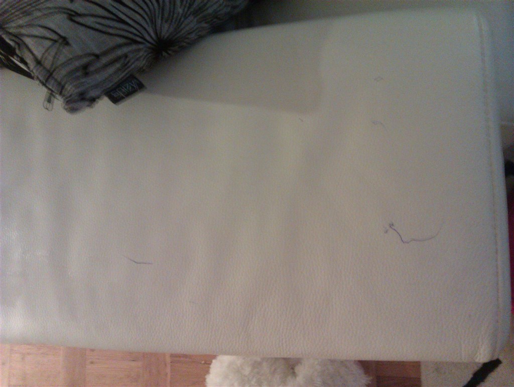 lærkes_mor skriver: Hej :-)Vi har været hos mine forældre idag. De har en ny hvid lækker lædersofa!!!Men enten Nor eller Lærke har været forbi den med en kuglepen Så nu er der et par flotte streger.Er der nogen der har nogle gode råd og fif til at få dem væk?Har prøvet med en klud med sulfo men der sker ingenting..Kram Sara