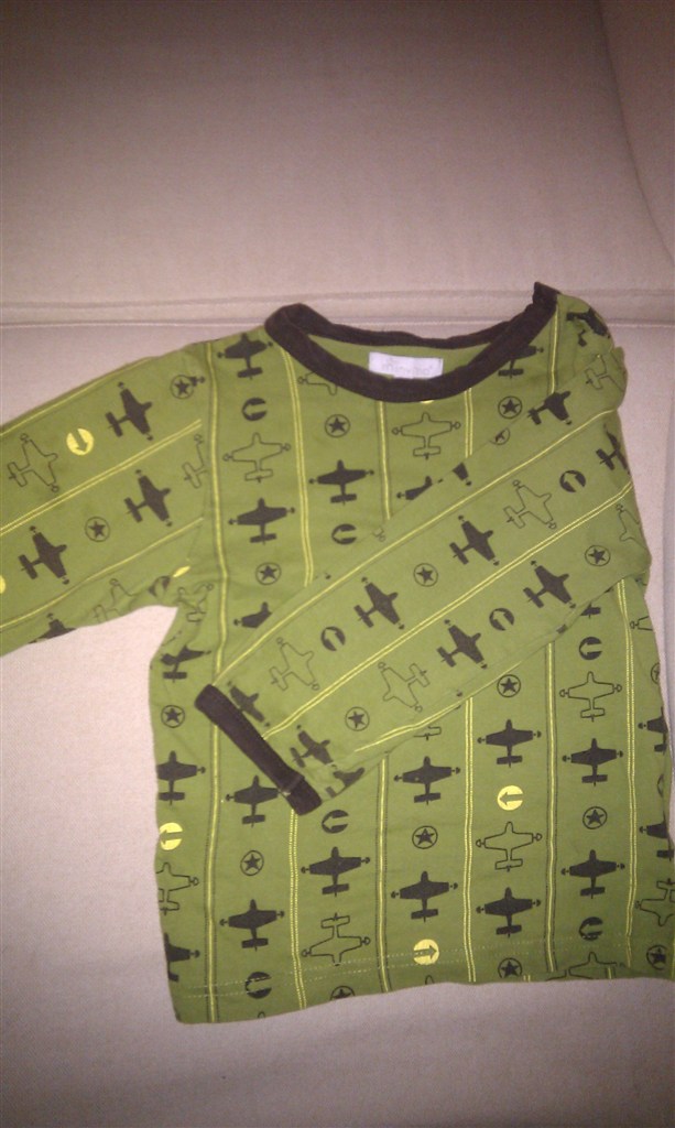 Billede 1: Olivengrøn Tiny Minymobluse med flyvemaskiner, str. 92, brugt men god.