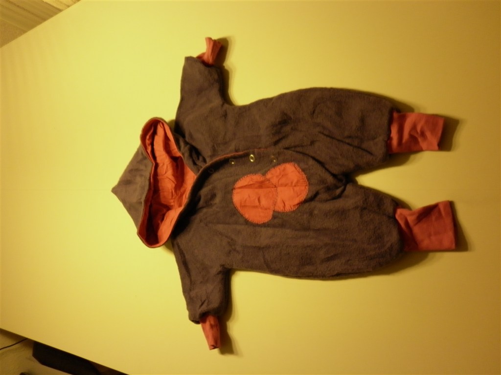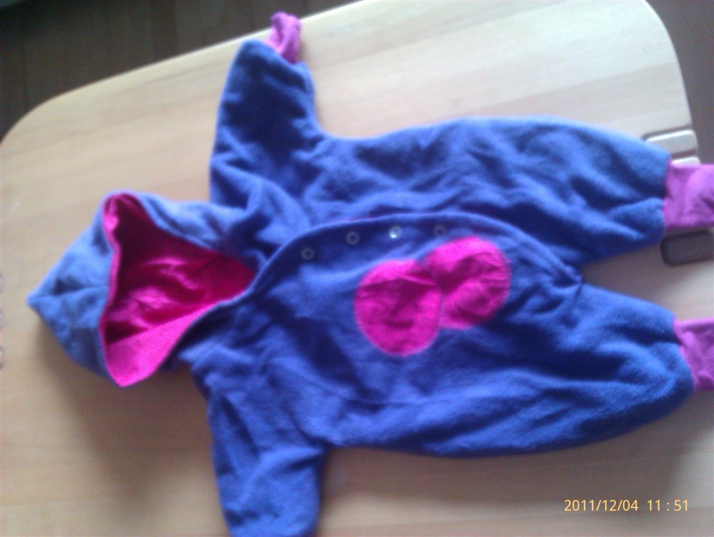 hehe det er en Lilla fleecdragt med Lyserød for og Pleter...