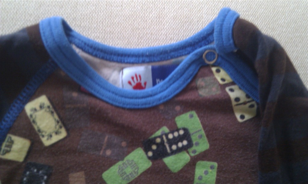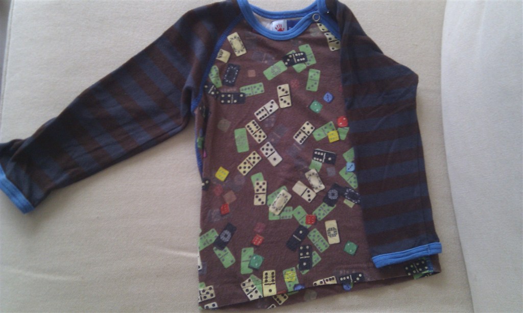 Billede 1-2: Molobluse med dominobrikker, str. 86, god men brugt, man kan se den er blevet vasket, men den fejler ingenting.