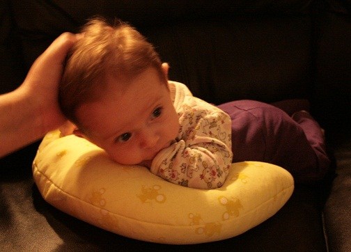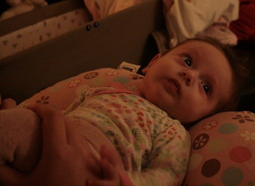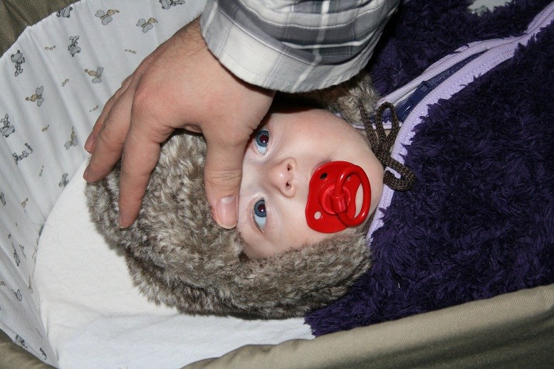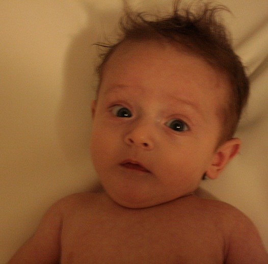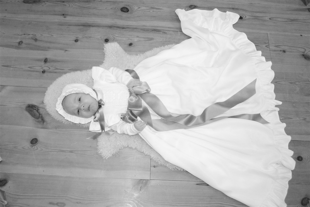 Billede 2: Et par dage efter dåben, hvor jeg fik taget nogle billeder af ham i kjolen, han er en rigtig dreng, for når han fik kjolen på blev han vældig utilfreds, så billederne er ikke blevet de bedste..