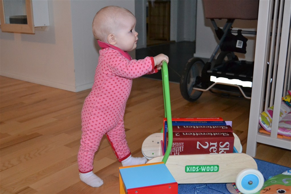 Hun begyndte at kravle, da hun blev 7 måneder og kommer hurtigt omkring, hun rejser sig op og går langs ting (fx sofabordet), med gåvogn og med vores støtte, men tror ikke hun lige begynder at gå selv foreløbig. Hun vinker, ryster på hovedet og laver kysselyde. Hun siger ikke nogle udtalte ord endnu, men snakker som et vandfald. To gange har vi ”hørt” det samme – ”And!” om hendes badeand, hvorefter hun prøver at efterligne os, når vi siger ”rap, rap” og ”Jeg gjorde ikke noget” som vi tror de to større børn i DP siger tit