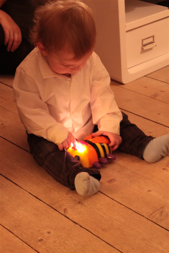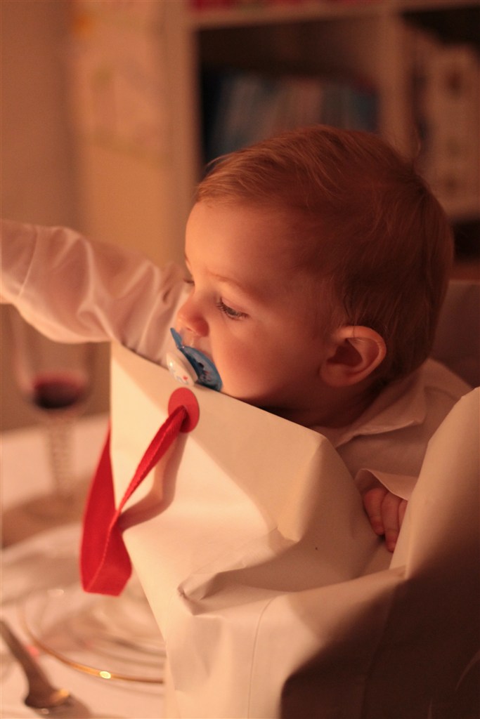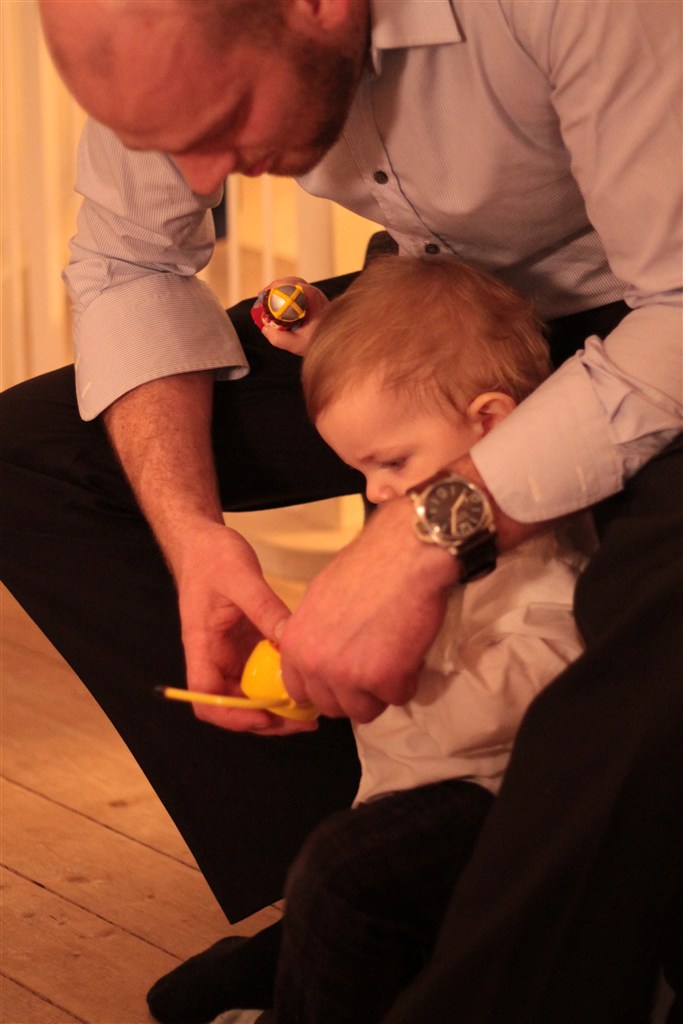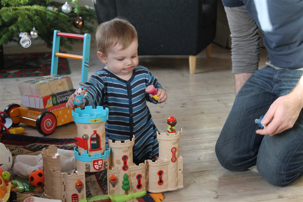 Da vi kom hjem fik vi vendt gåsen i ovnen, og spiste laksemadder. Så blev Kirstine hentet, og jeg fik svigerne duttet ind i stuen så jeg kunne dække op til fint julebord og så skulle kartoflerne skrælles og alt det andet.  Richard sov fra kl. 16 til vi vækkede ham kl. 18.45 da maden var klar (alt den virak i kirken havde da helt udmattet ham). Han var pylret og forvirret under maden, så da vi havde spist udskød vi ris a la mande og gik til juletræsdans han accepterede med stor undren, og derefter gaverne som han var lettere uinteresseret i. Han havde om morgenen fået et Robind Hood/Kong Richard play2learn slot som han elsker og helst ville lege med. Så var det meningen at han skulle i seng, men så vågnede han ligesom op til dåd og charmede og legede og var i total hopla. Så han kom med til bords igen til dessert, og bagefter hyggede han max indtil kl. 22.30 hvor det altså var godnat. Først herefter gik vi igang med at åbne de voksnes julegaver, dejligt i ro og fred. Selv om Mikkel og jeg ikke var på gaver med nogen i år, fik vi alligevel mange ting. En dejlig overraskelse. Så jeg fik en kamerataske, en nederdel, to trøjer, en chek, et spil og en creme. Total luksus, og jeg må med undren melde at jeg faktisk blev meget mere glad for gaverne fordi at de ikke var ventet!