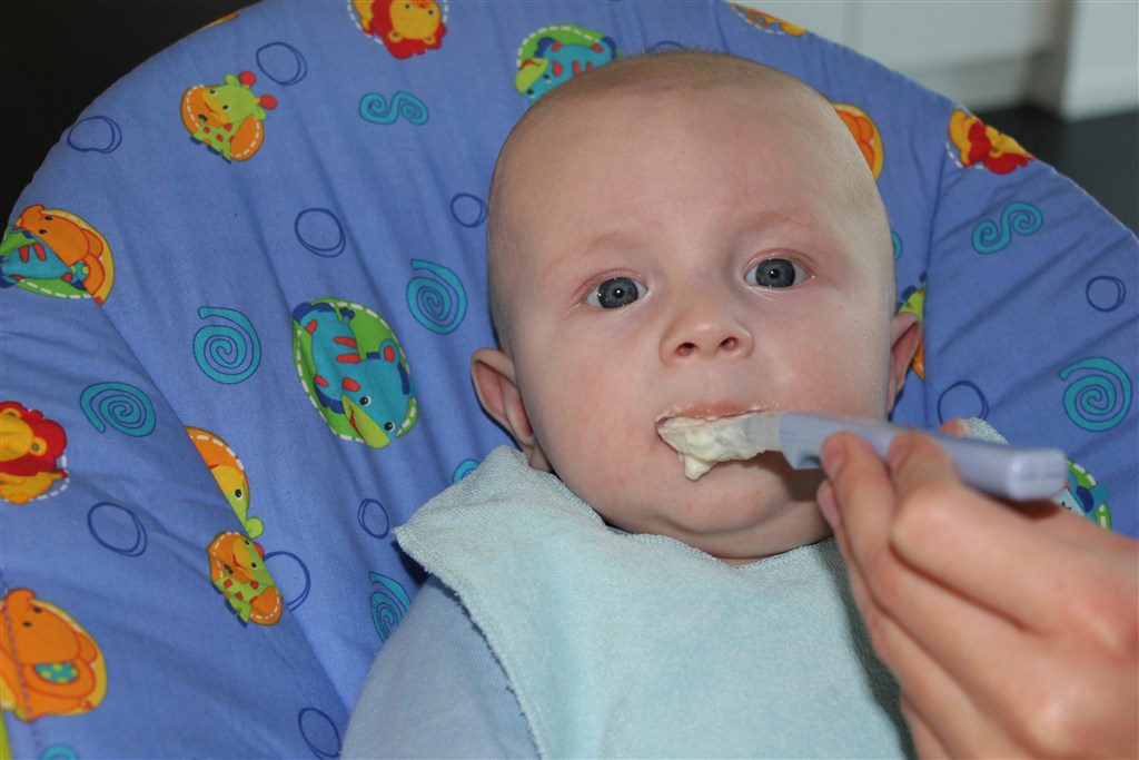 Hvordan tog han grøden? Vi prøvede lidt i går og i dag. Man kan se det er svært for ham