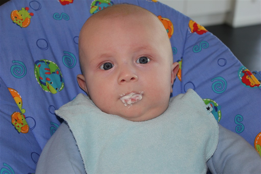 Det tager han rigtig pænt imod, men når han får den første ske fuld ser han lidt sjov ud!!