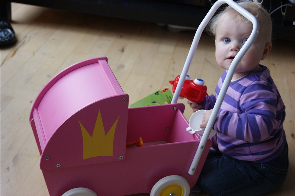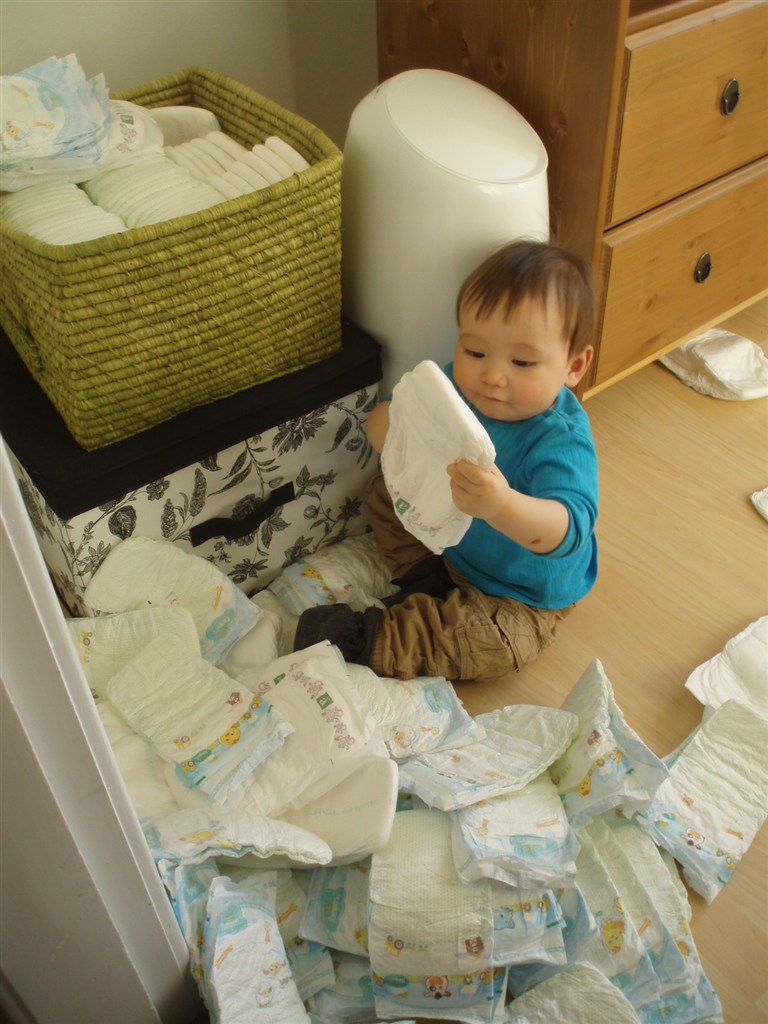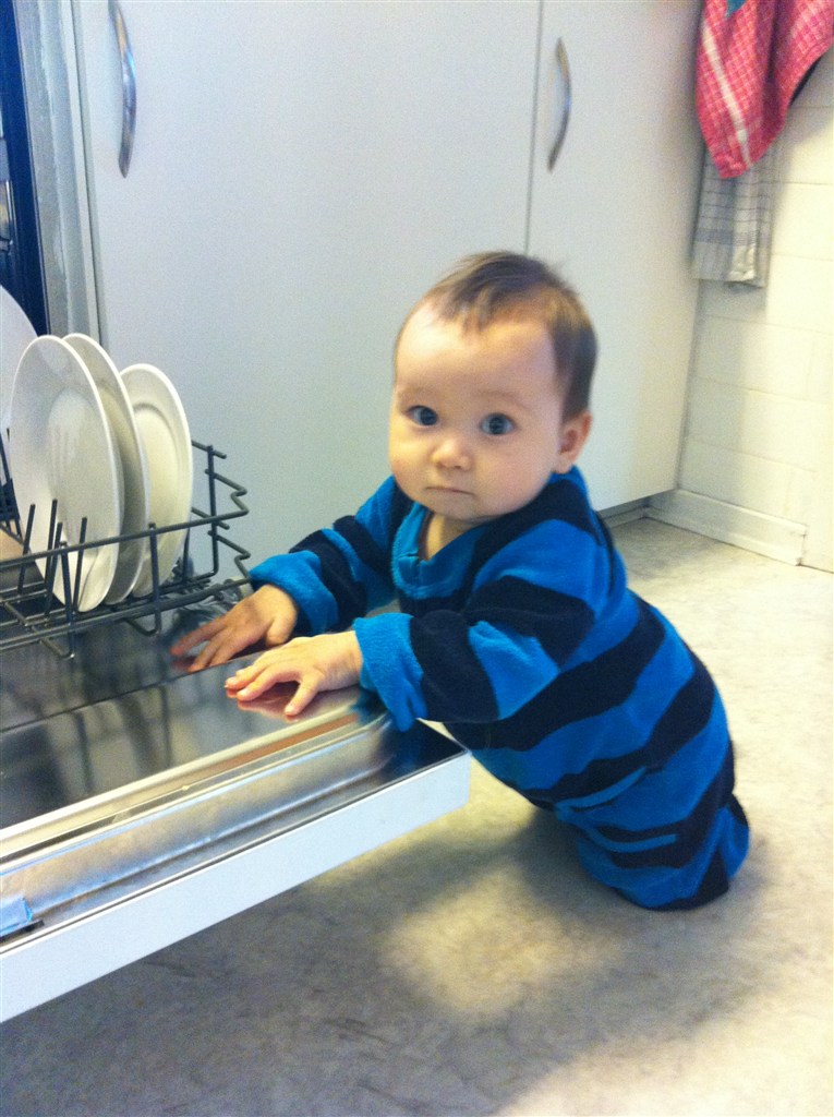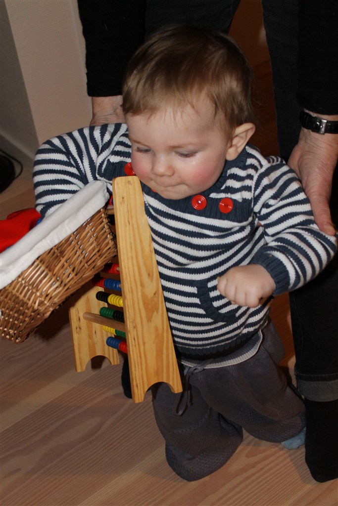 12. mdr. gammel. Richard som han er netop nu. Altid bærende på et eller andet. Han kravler ofte på albuerne fordi hænderne er fyldt med lego/bamser/bøger/biler. Her kommer han gående med både kurv og perle-tæller, med balancestøtte fra mormor.