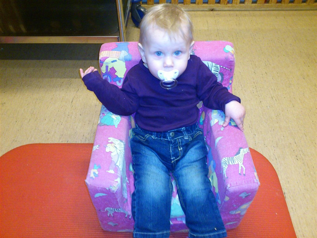 Isabella er begyndt at synes det er sjovt at sætte sig på stole, kasser - you name it. Jeg har vedlagt et billede, hvor hun sidder på en "lænestol" i hendes vuggestue (hun er ret glad for den), men hvor pokker kan man købe sådan en henne? Er der nogle af jer der er stødt ind i det på nettet?