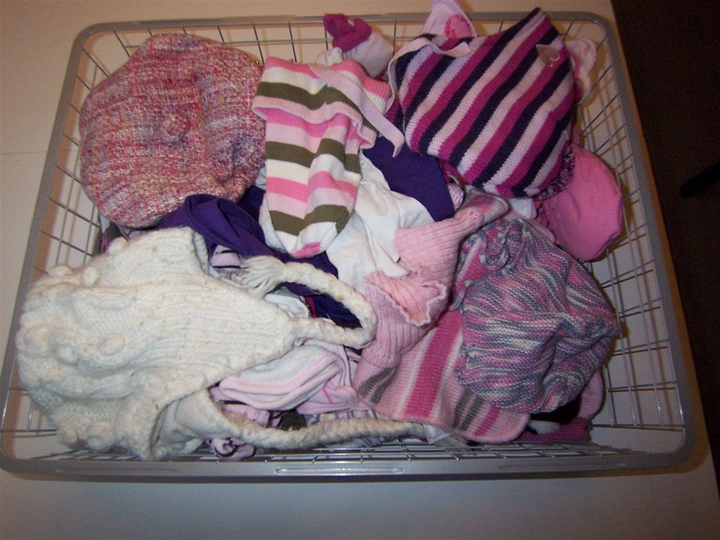1 pose fyldt med hatte ,sutsko,strømper,vanter
