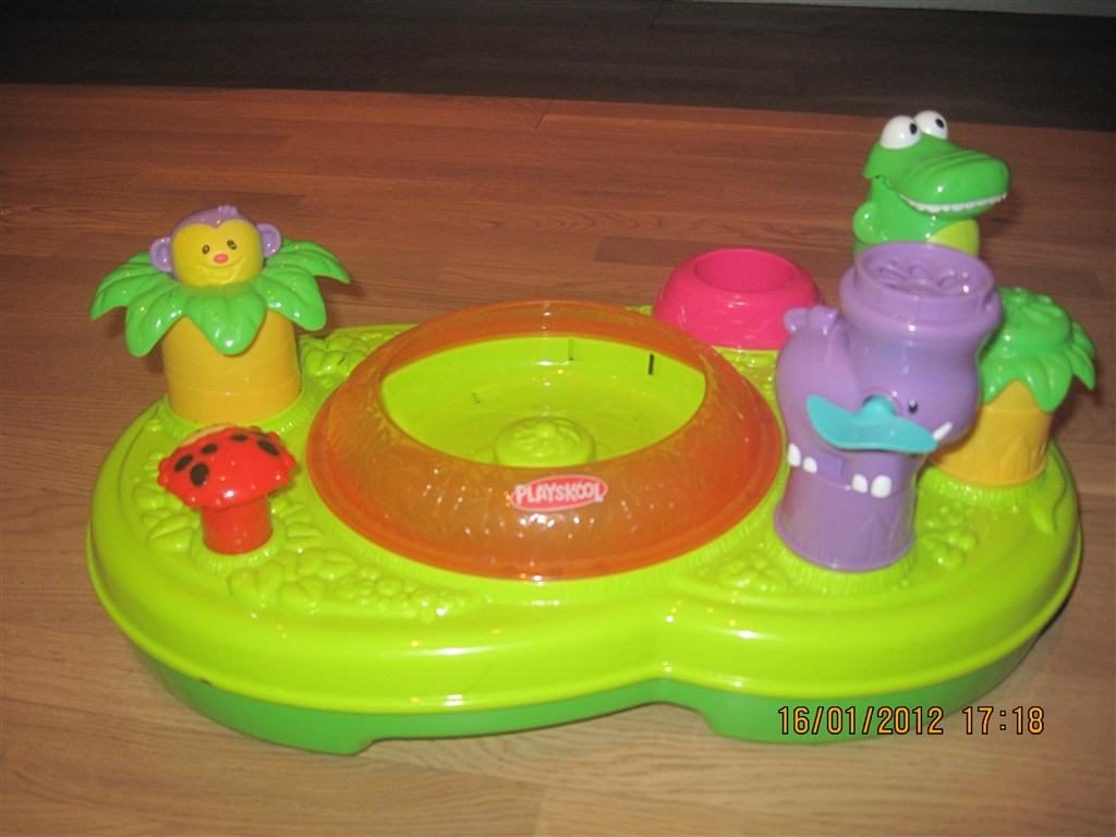 Billed 10 - Man trykker på 'blomsten' hvor den så begynder og blæse luft og dyrene drejer rundt. Der høre en bold til som skal være nede i hullet hvor den så bliver blæst rundt af luften. Og så spiller den musik.