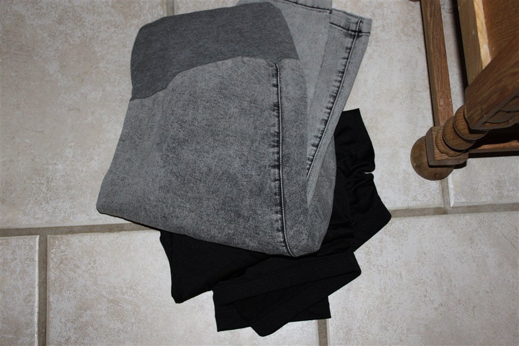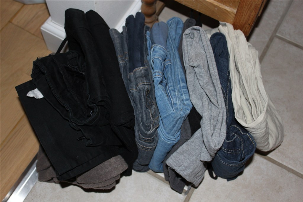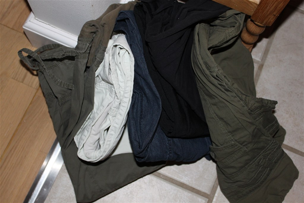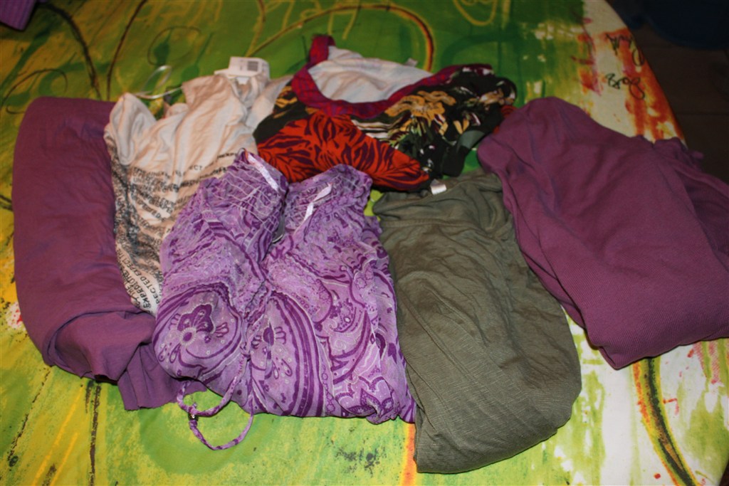 Masser af bukser, både lange og 3/4, 2 par leggins, 2 nederdeler, 1 par shorts, 3 par mama trusser (helt nye) 1 mave 'bælte' og 6 bluser/tunika, som dog ikke er 'rigitgt' graviditets tøj, men stadigvæk med plads til maven, og som sidder rigtigt flot, når der kommer mave på.