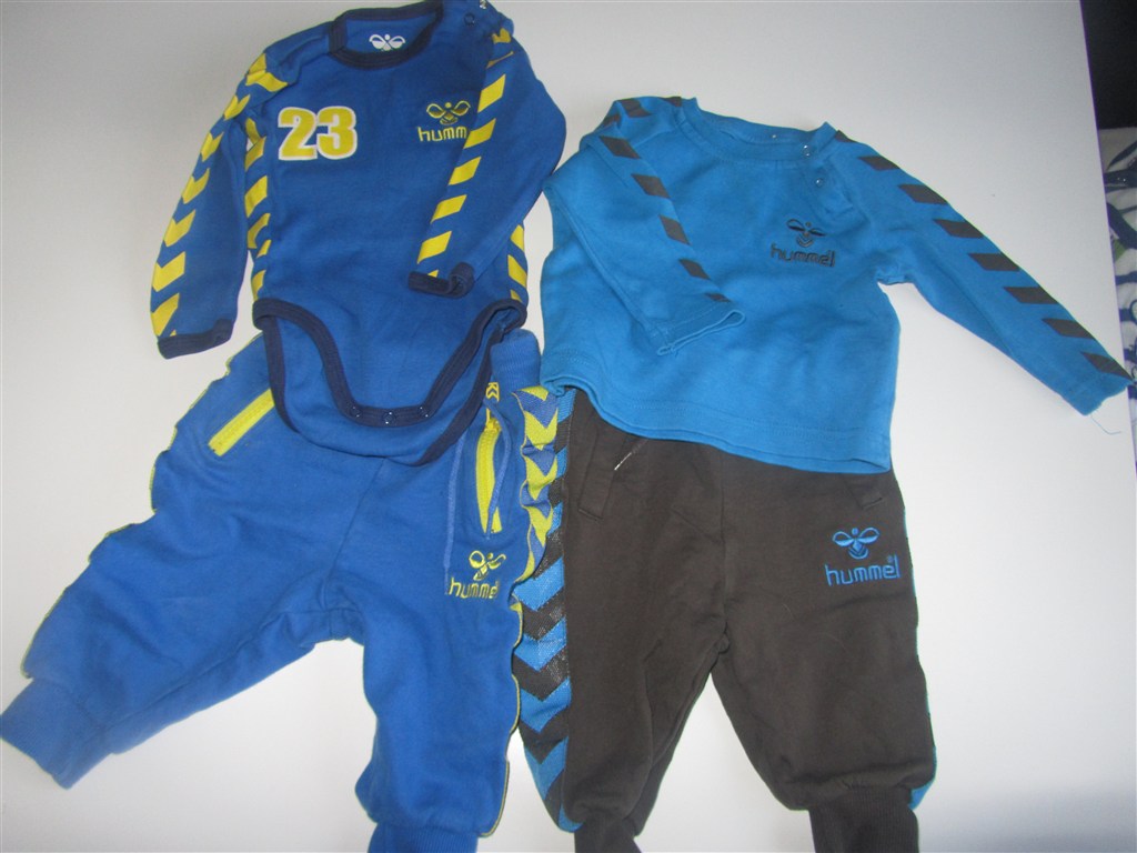 Det ene er blå med gule vinkler. På den langærmede body står der stort nr på ryggen. Tryk/vinkler er lidt krakeleret nogen steder, men super sejt sæt. 85 kr plus porto.