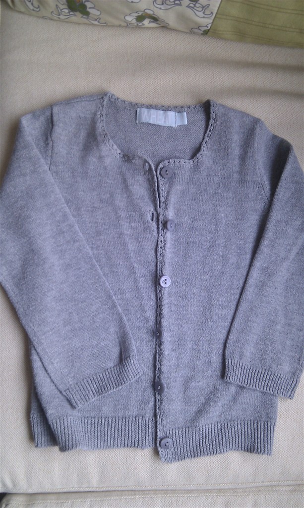 malo skriver: Sød strikket cardigan i lysegrå, str. 74, fra Wheat. Byd