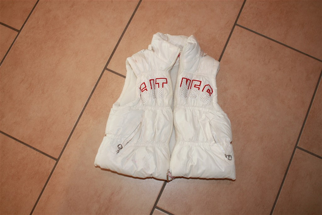 den hvide vest er str 2 men hun kunne passe den sammen tid med jakerne.. den har et lille lysserrød mærke der er under lommen se foto..