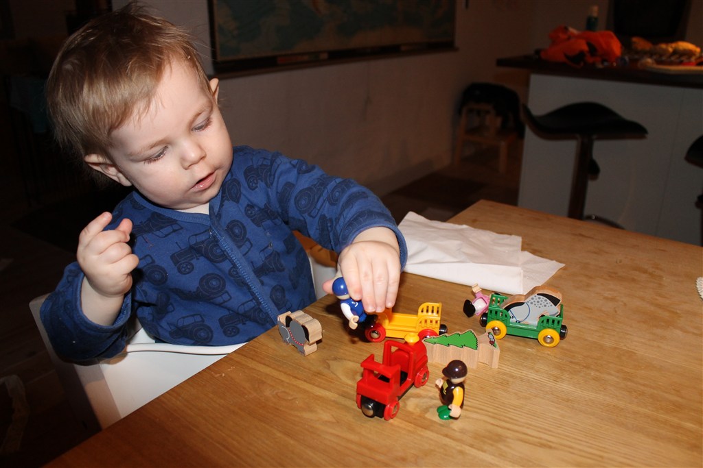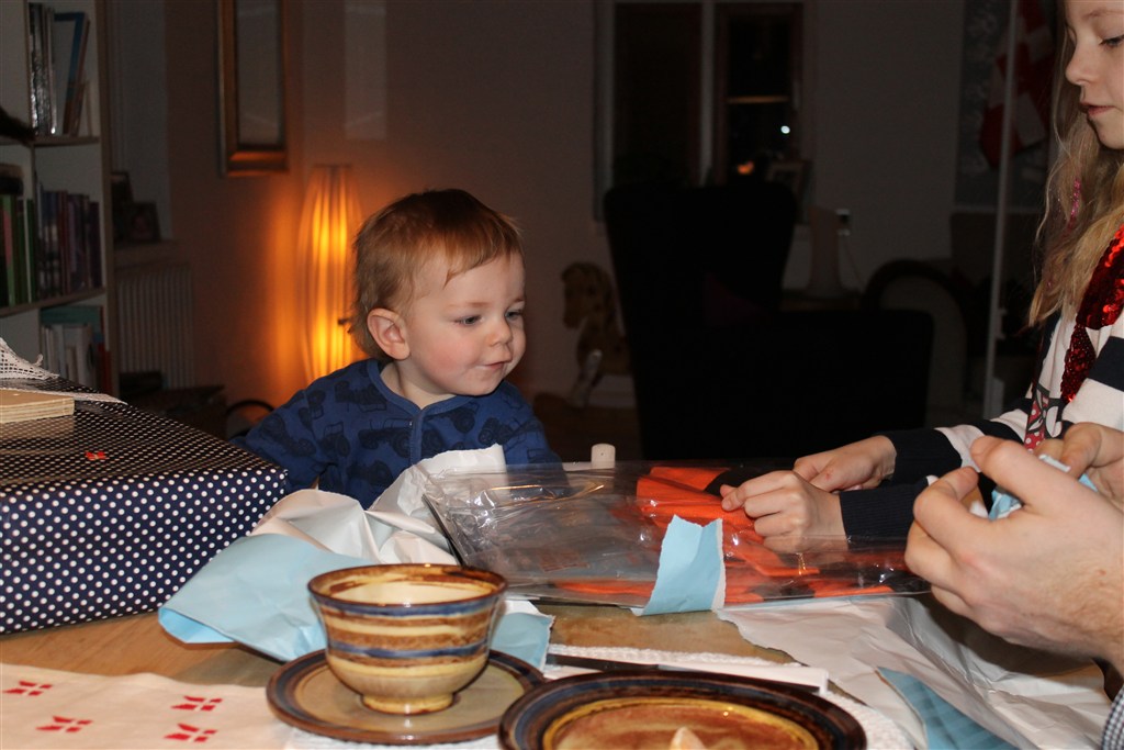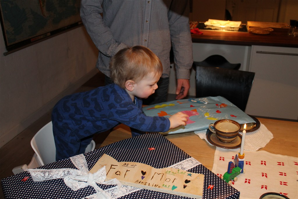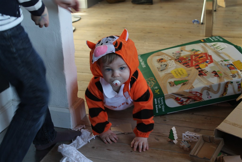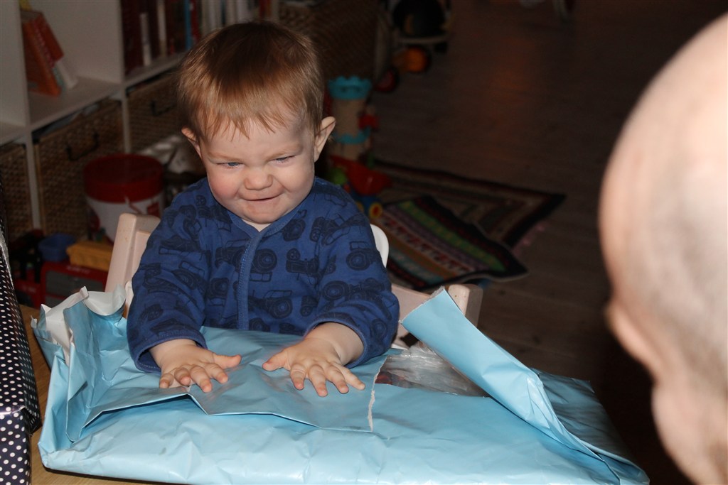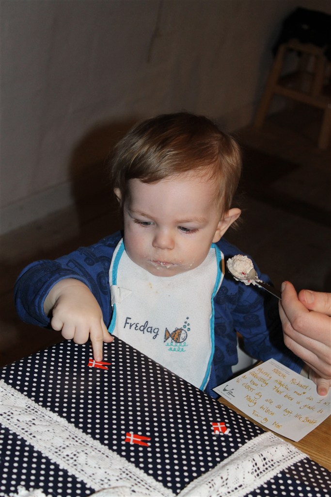 Her til morgen er Richard så mirakuløst ikke vågnet før os. Vi kommet i tøjet, henter flaget og lister ind på børneværelset. Kirstine vågner straks, og vi begynder og synge. Richard ser ret overrasket ud men begynder også at grine, og er generelt ret pjattet med at vi sådan kommer med flag og synger. Han kommer op og vi går til morgenbordet. Jeg får bollerne på pladen og i ovnen. Richard kan ikke helt samle sig om gaverne da der ligger mandariner på bordet (I know... min fejl), så efter han har fået en af dem åbner han pakker med assistance fra Kirstine. Han fik af hende et tigerdyre-sæt som hun havde valgt, og af os en Brio togbane. Han legede straks med togene og dyrene, men skinnerne ser han ikke den store fidus til og de skal vist pakkes væk lidt (længe?) endnu. Derudover væltede han kun mælk een gang, og kravlede kun op af stolen to gange, så alt i alt en meget vellykket morgen