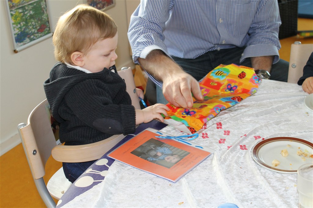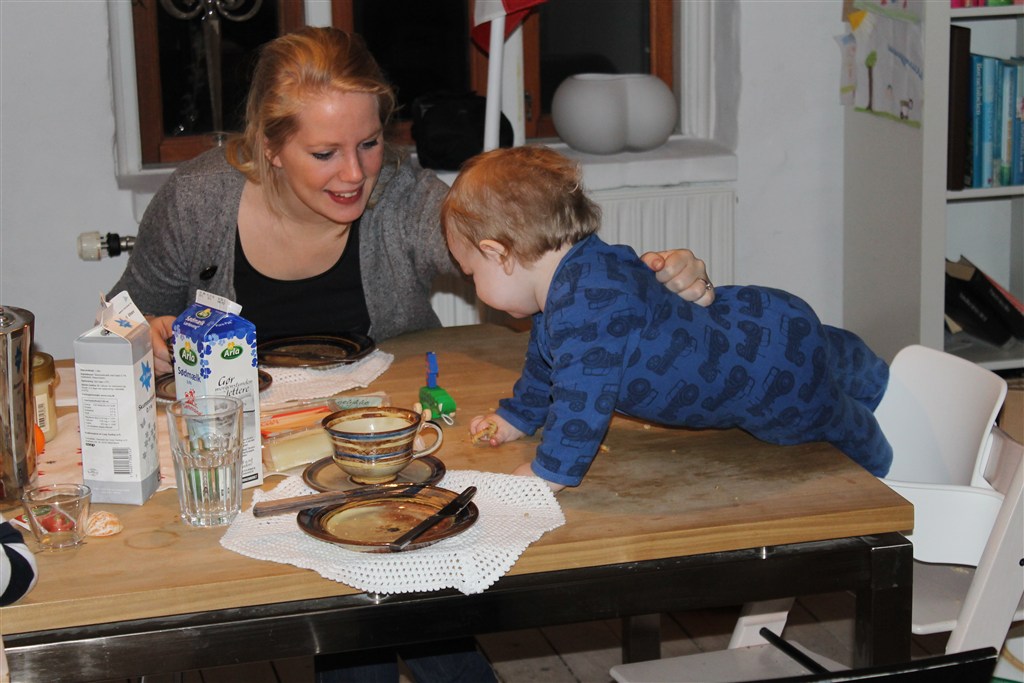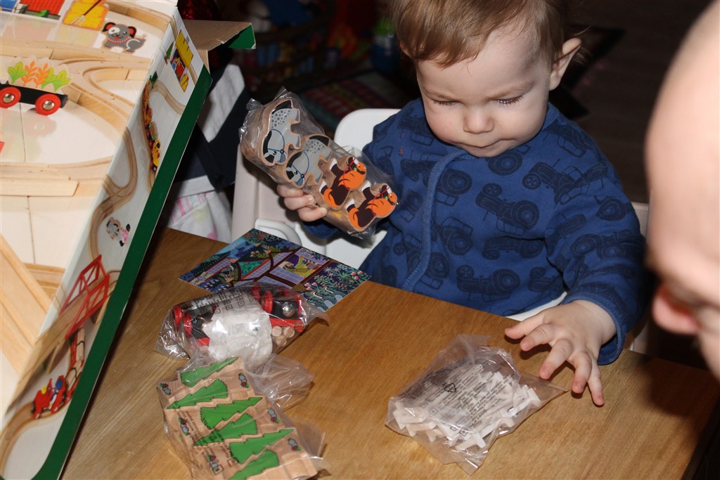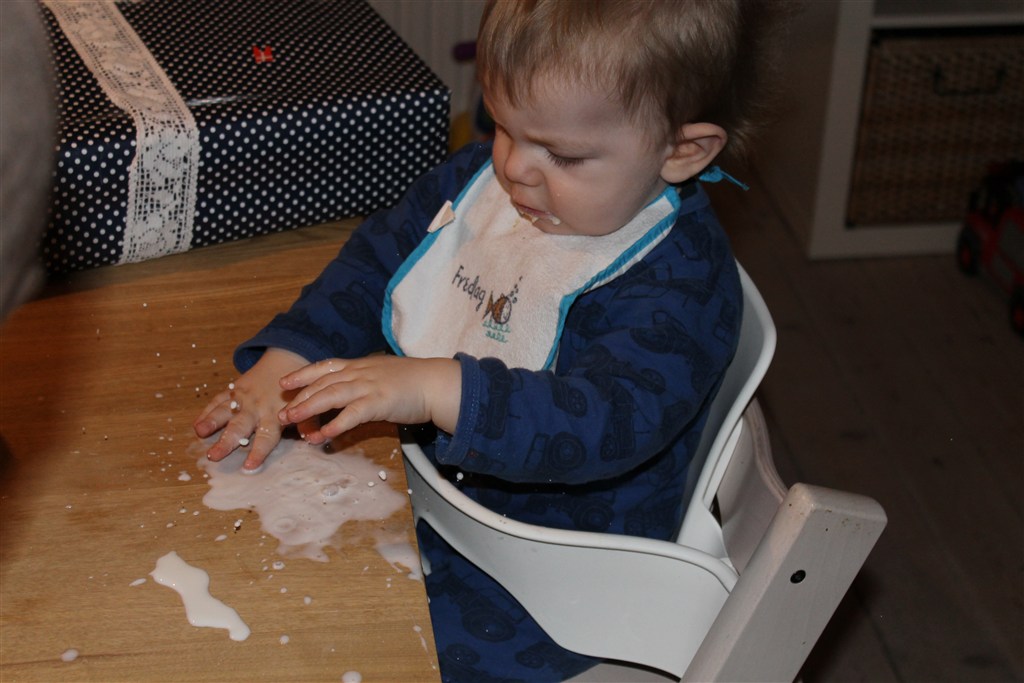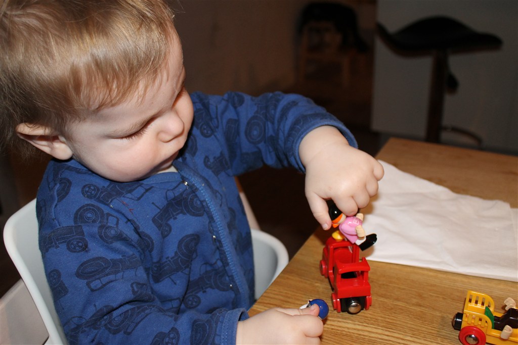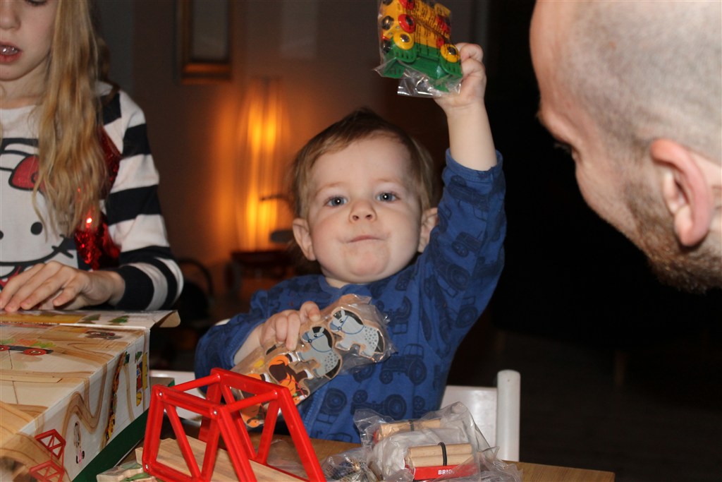 Her til morgen er Richard så mirakuløst ikke vågnet før os. Vi kommet i tøjet, henter flaget og lister ind på børneværelset. Kirstine vågner straks, og vi begynder og synge. Richard ser ret overrasket ud men begynder også at grine, og er generelt ret pjattet med at vi sådan kommer med flag og synger. Han kommer op og vi går til morgenbordet. Jeg får bollerne på pladen og i ovnen. Richard kan ikke helt samle sig om gaverne da der ligger mandariner på bordet (I know... min fejl), så efter han har fået en af dem åbner han pakker med assistance fra Kirstine. Han fik af hende et tigerdyre-sæt som hun havde valgt, og af os en Brio togbane. Han legede straks med togene og dyrene, men skinnerne ser han ikke den store fidus til og de skal vist pakkes væk lidt (længe?) endnu. Derudover væltede han kun mælk een gang, og kravlede kun op af stolen to gange, så alt i alt en meget vellykket morgen