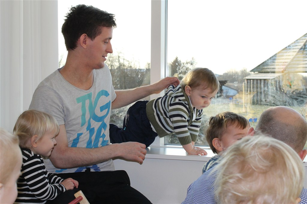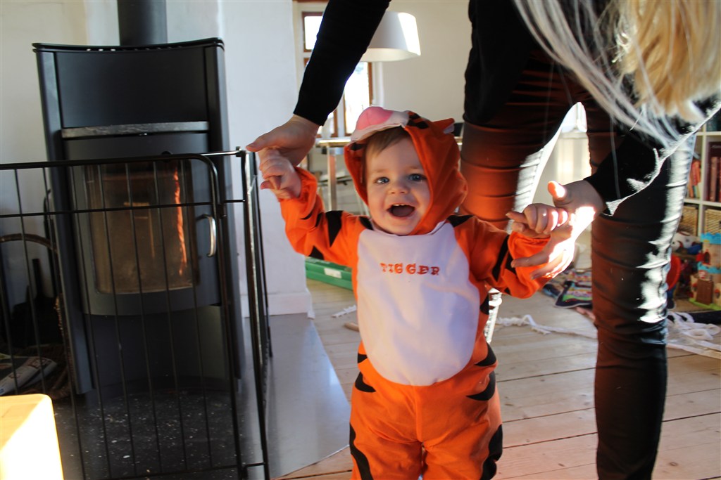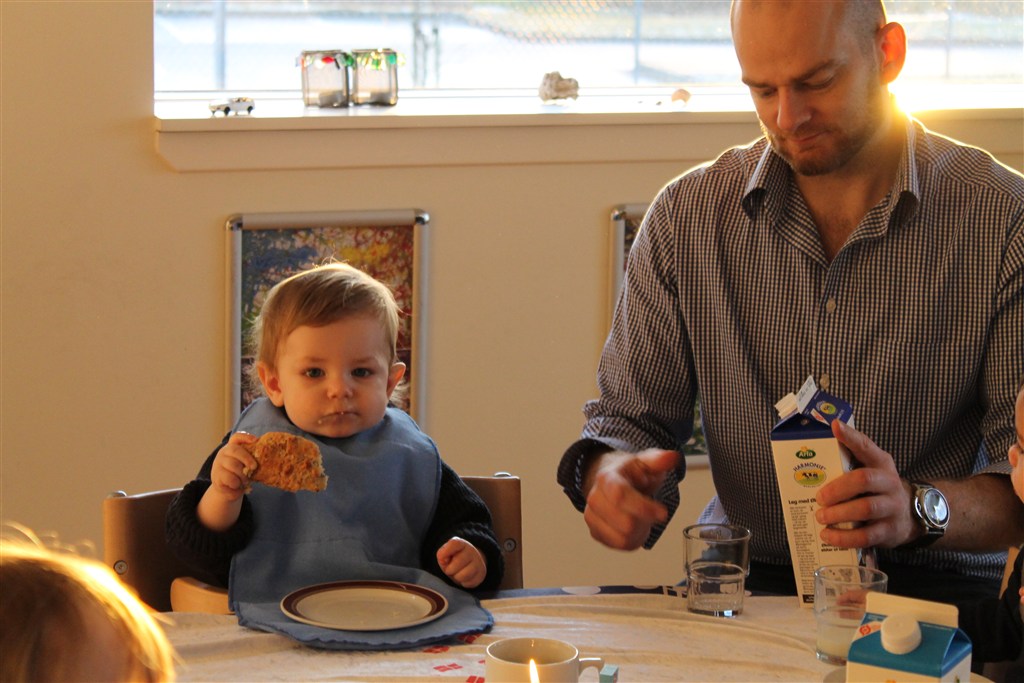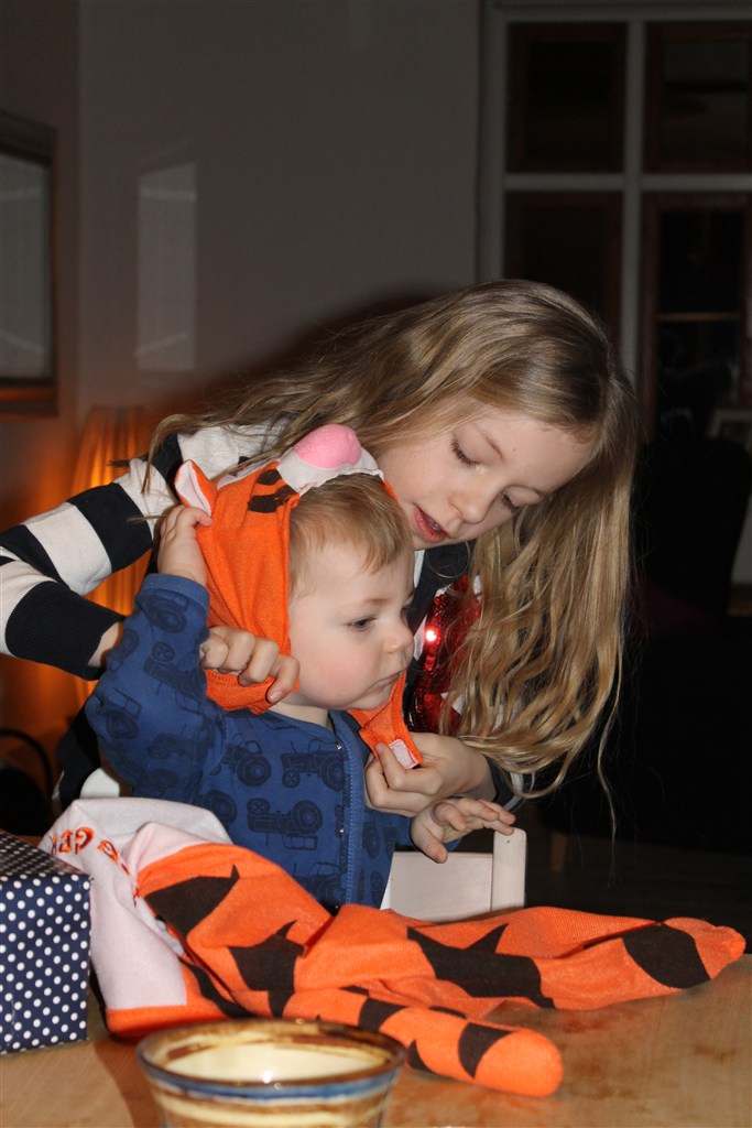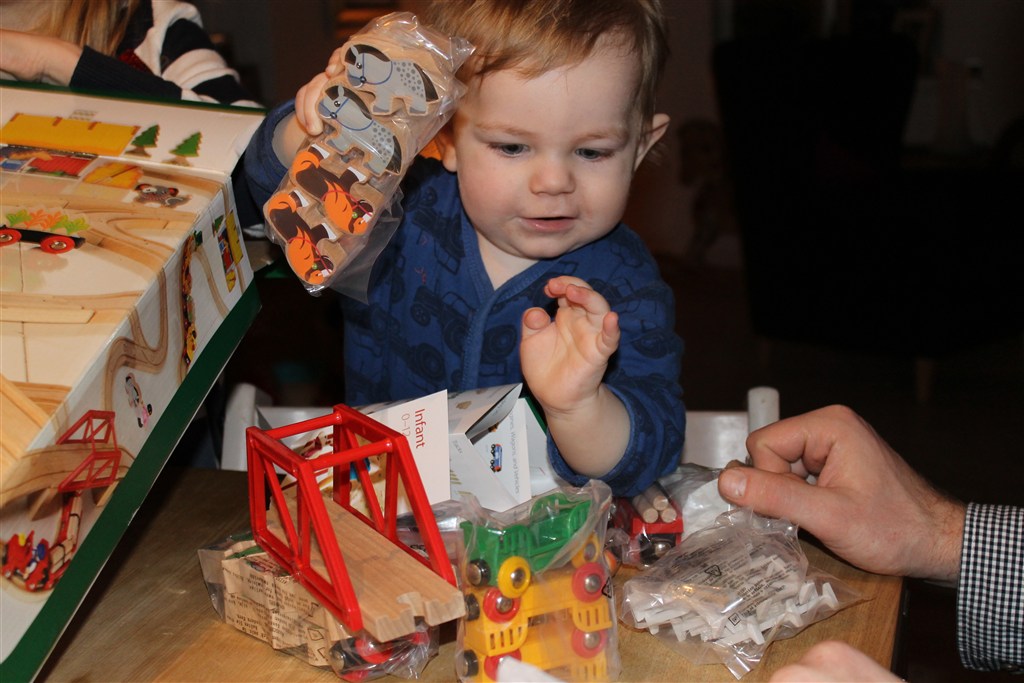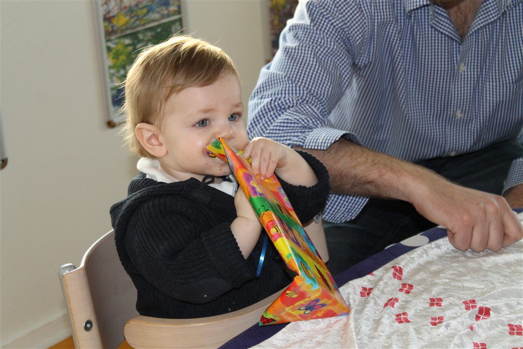 Her til morgen er Richard så mirakuløst ikke vågnet før os. Vi kommet i tøjet, henter flaget og lister ind på børneværelset. Kirstine vågner straks, og vi begynder og synge. Richard ser ret overrasket ud men begynder også at grine, og er generelt ret pjattet med at vi sådan kommer med flag og synger. Han kommer op og vi går til morgenbordet. Jeg får bollerne på pladen og i ovnen. Richard kan ikke helt samle sig om gaverne da der ligger mandariner på bordet (I know... min fejl), så efter han har fået en af dem åbner han pakker med assistance fra Kirstine. Han fik af hende et tigerdyre-sæt som hun havde valgt, og af os en Brio togbane. Han legede straks med togene og dyrene, men skinnerne ser han ikke den store fidus til og de skal vist pakkes væk lidt (længe?) endnu. Derudover væltede han kun mælk een gang, og kravlede kun op af stolen to gange, så alt i alt en meget vellykket morgen