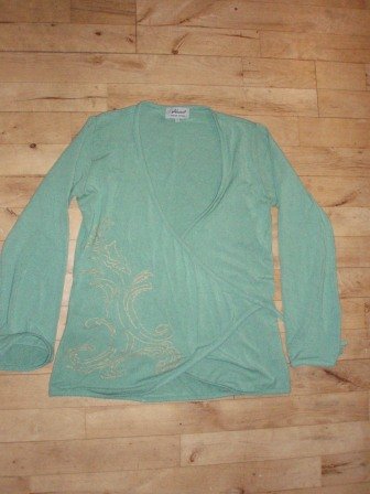 - Slå-om bluse fra Abovo, str S. Sød mintgrøn farve med guldmønster på den ene side. Også i rigtig flot stand uden huller. pletter eller anden tegn på slid.
