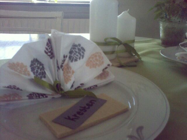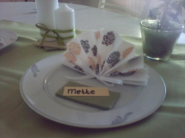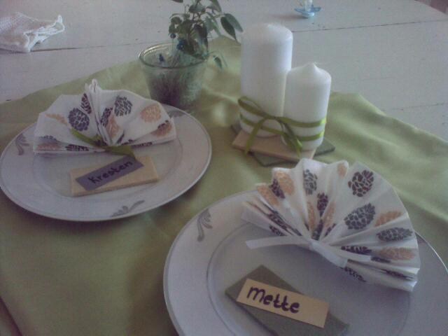 Bordkortene er lavet af noget papir jeg havde i min krea-kasse, og bunden er lavet af det overskydende filt, jeg havde fra at lave de der til under lysene. Servietter var vi heldige at kunne få 3 pk á 20 til 20 kr, båndet til lysene og servietterne er også fra min krea-kasse og blomsterne vi skal have med bliver nok en masse af mine orkideer, hvis ikke vi går all-in og køber nogle flotte tidstypiske blomster, så som nogle vintergækker eller påskeliljer.