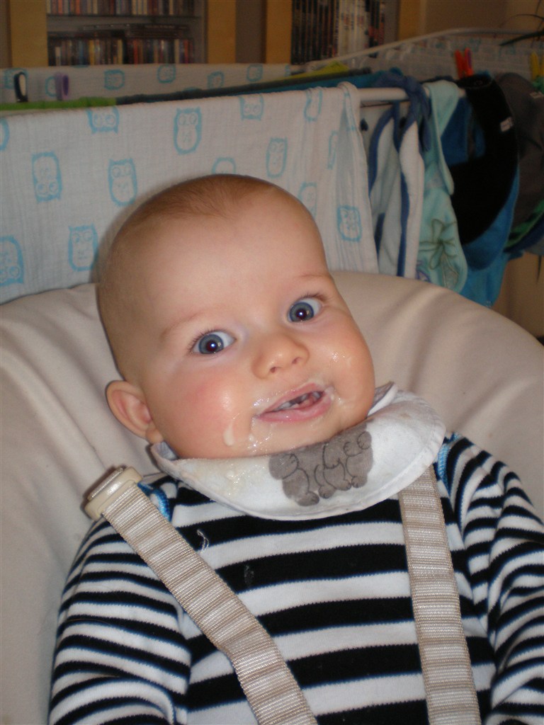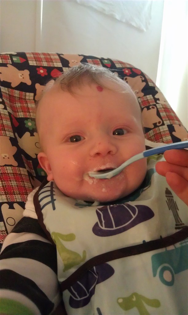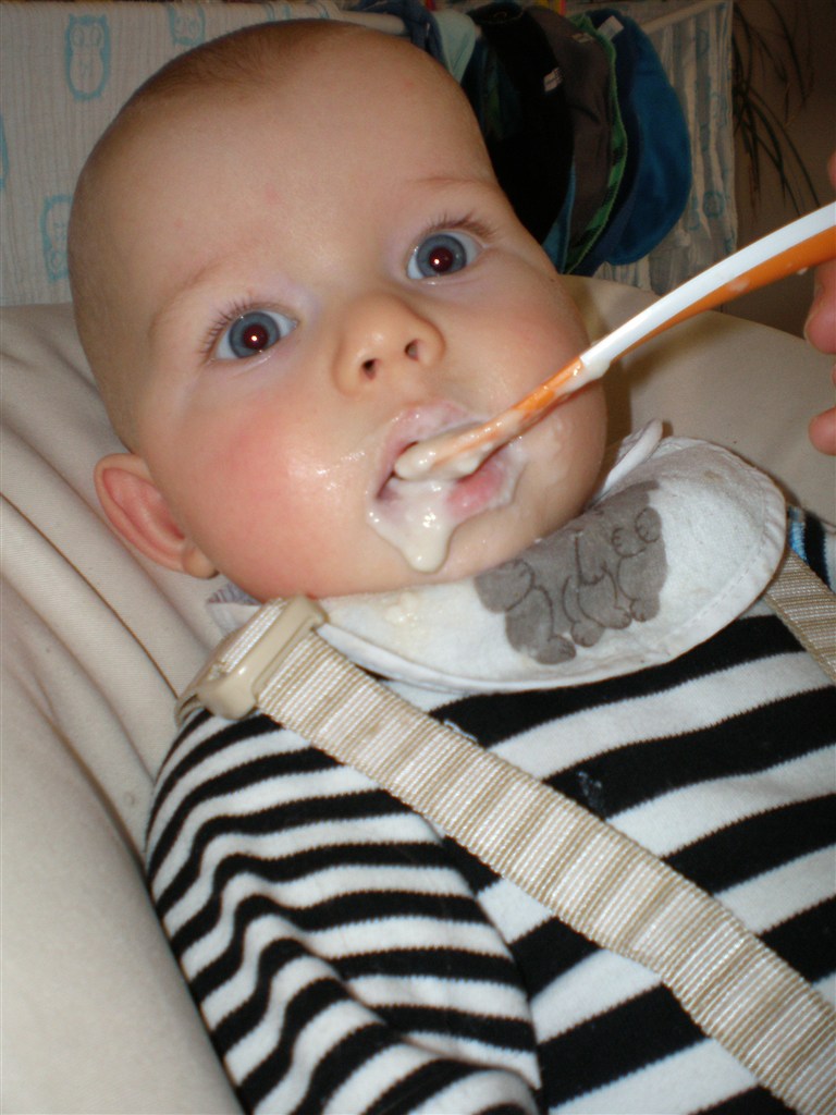 Nu er det godt nok et stykke tid siden, meeen du skal ikke snydes, jeg lovede jo at komme med lidt billeder når Frej skulle have sin første grød..