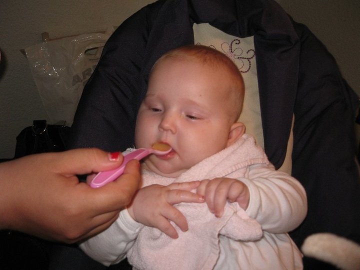 Emilies allerførste mundfuld grød, fik jeg foreviget i går, og det er da bare det kæreste billede