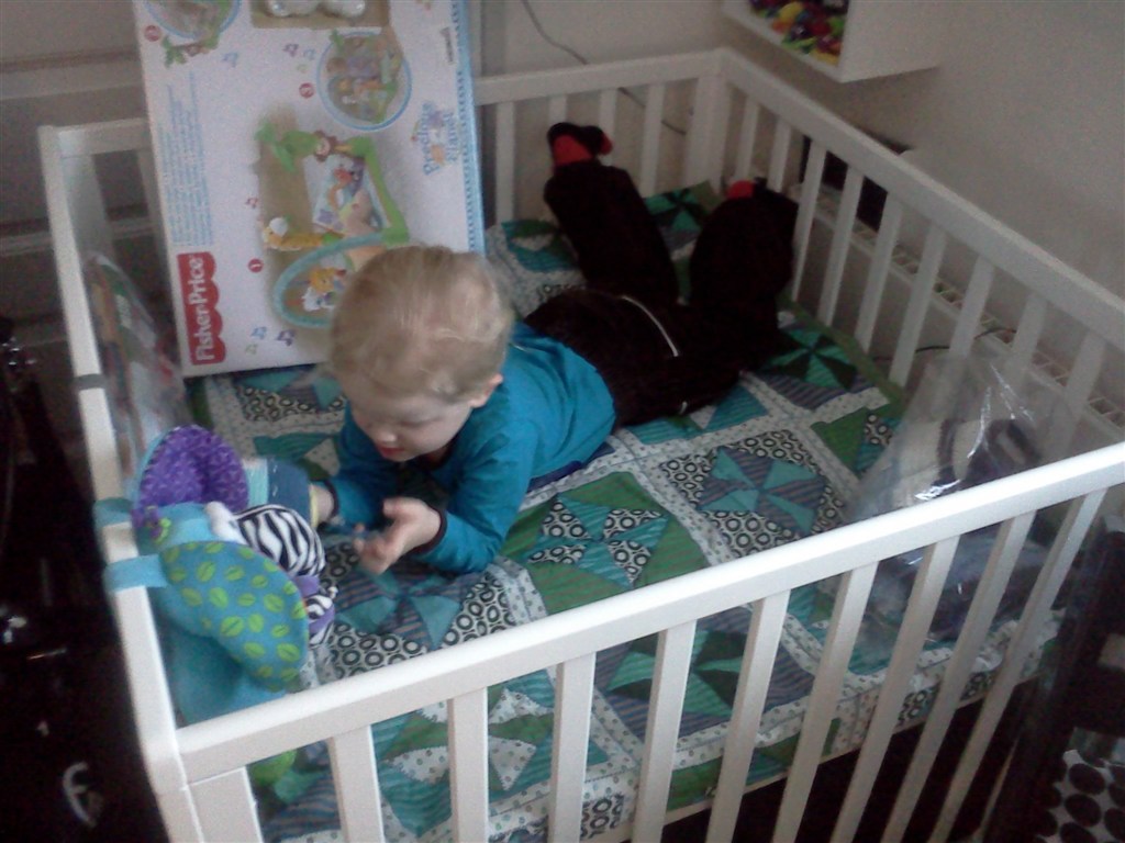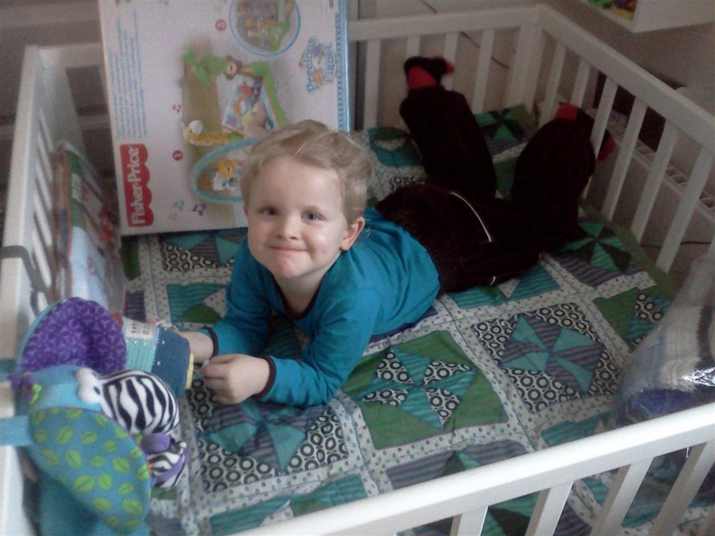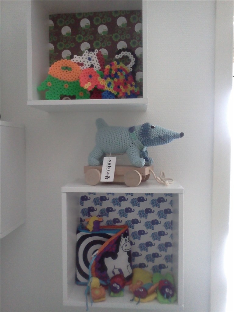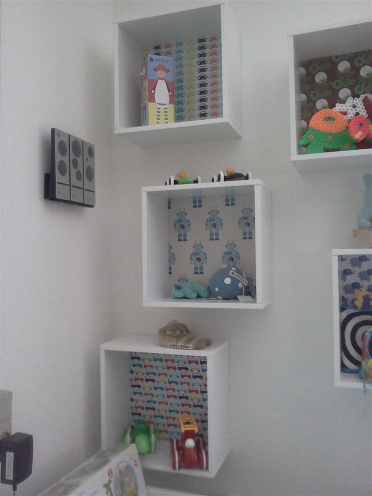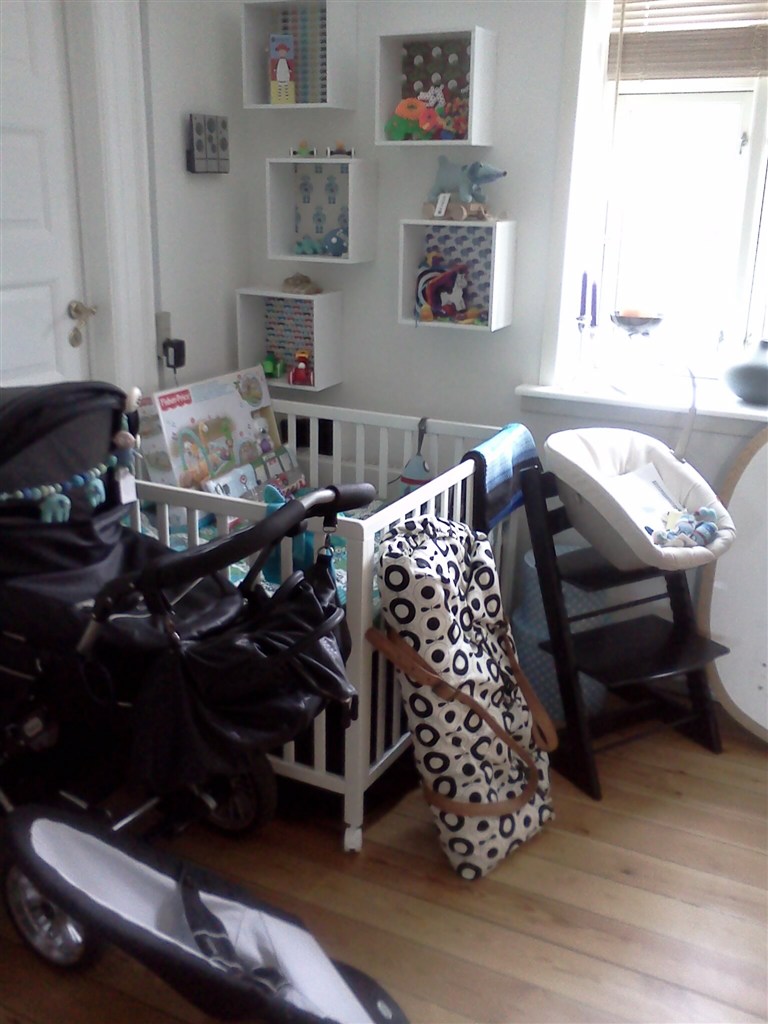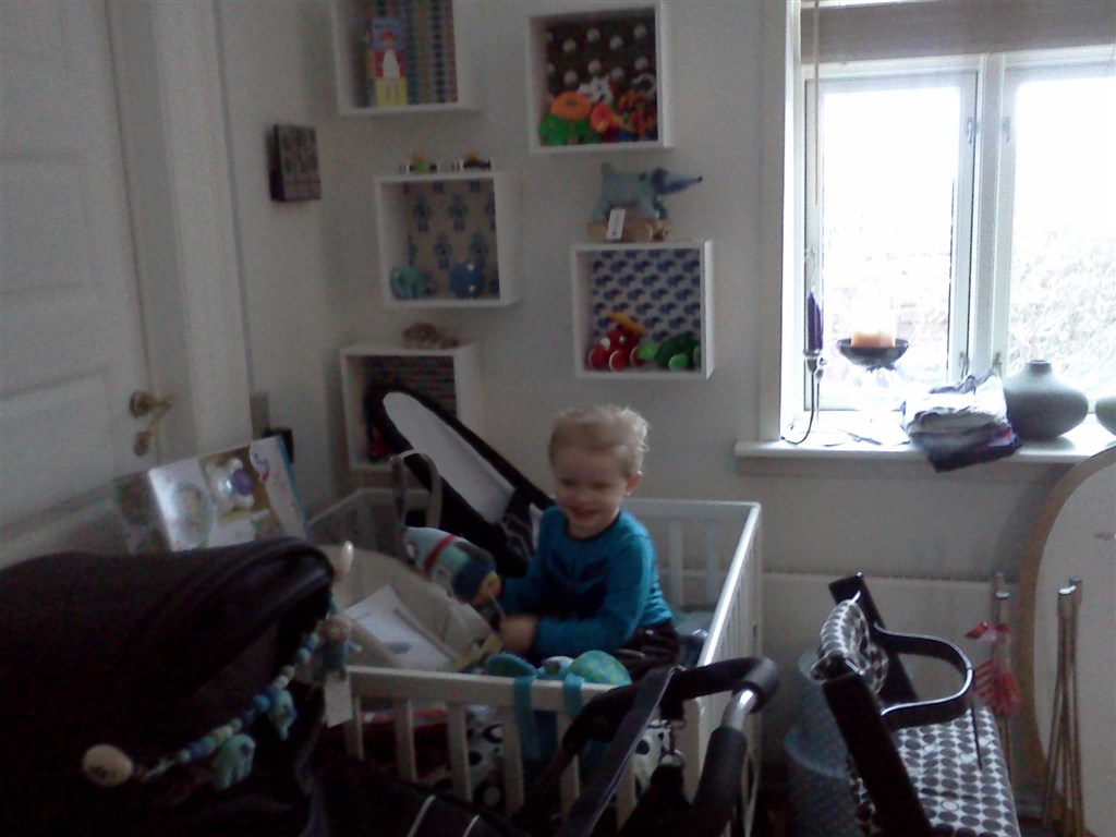 Da vi ikke har noget værelse til lillebror får han et hjørne i den ene stue...og tremmeseng i soveværelset og vugge i den anden stue.. vi satser på at være flyttet når han engang skal have et værelse.. men jeg har sagt at jeg først ville lave bogkasser osv når jeg var halvejs og det er jeg i dag så vupti vupti.. nu er de sat op, og lillebrors hjørne er ved at forme sig.. storebror har lige godkendt kravlegården , og sat hans perleplader op på en hylde som han har lavet til lillebror, samt noget af hans gamle legetøj... han var meget stolt og han skulle lige høre om han så også godt måtte lege deropppe engang i mellem... så han blev glad da han godt måtte... storebrors hit er rumraketten fra sebra" mor den er sej og så spiller den" er det ikke blevet fint.....
