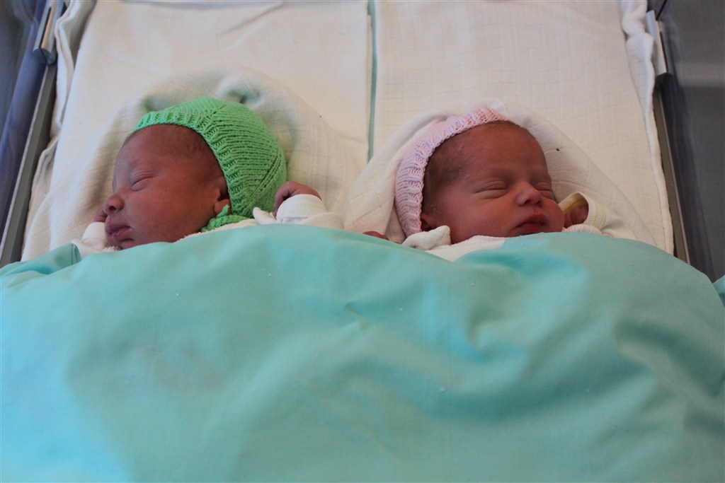 Jeg blev mor den 4. februar kl. 01.27 og kl. 01.28. Det skete efter 3 ugers indlæggelse med voldsomme blødninger på grund af en foranliggende moderkage og en afkortet livmoderhals på 0,5 cm. Pludselig styrtblødte jeg og mistede 3 liter blod, så de foretog akut kejsersnit, hvor jeg var under fuld bedøvelse. Jeg vågnede op til den smukkeste pige på 2346 G og 44 cm og en vidunderlig prins på 2781 G og 46,5 cm.