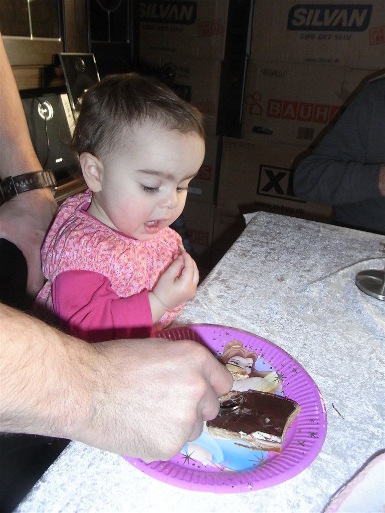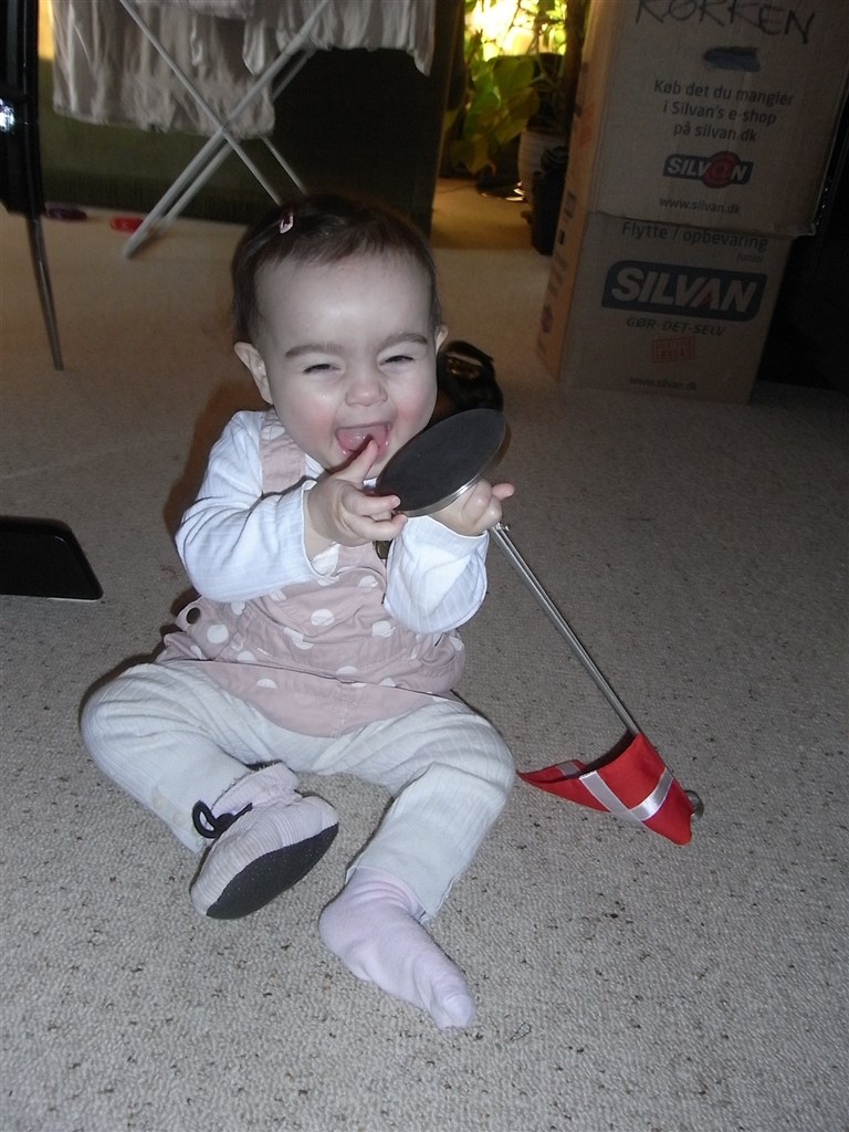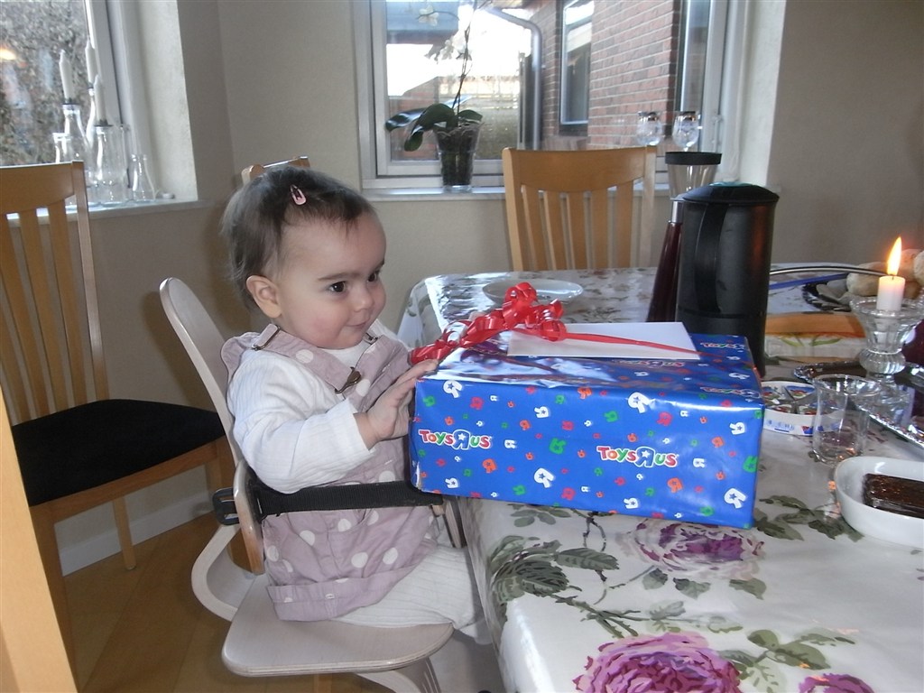 Billedet, hvor hun pakker gaven op er fra DP-moderen i formiddags, som gav hende en dukke, som griner nærmest bare, man kigger på den - den skal vi nok blive glade for!