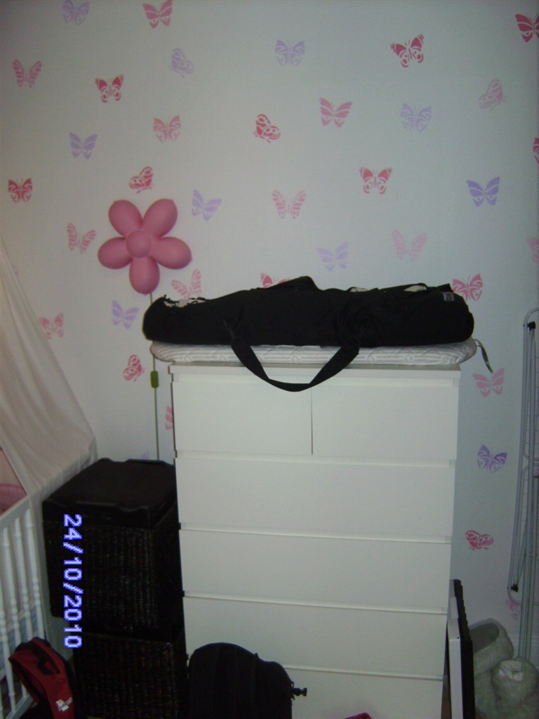 Har ik lige et billed , men vi valgte at male en væg i en lækker grønlig farve og så var wallstickers et træ med masser og ugler, blade og fugle i en masse lækre farver